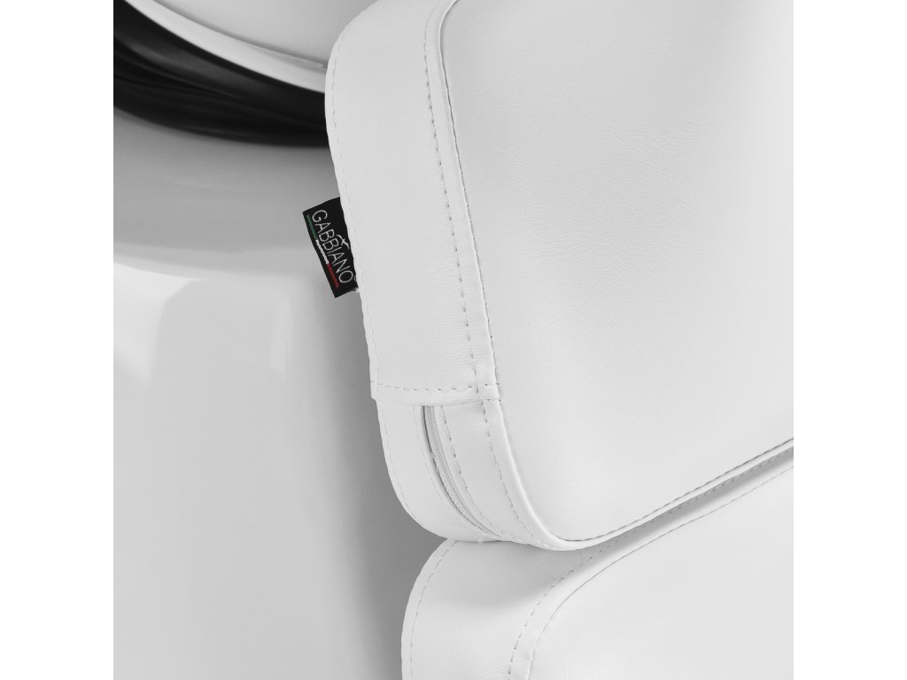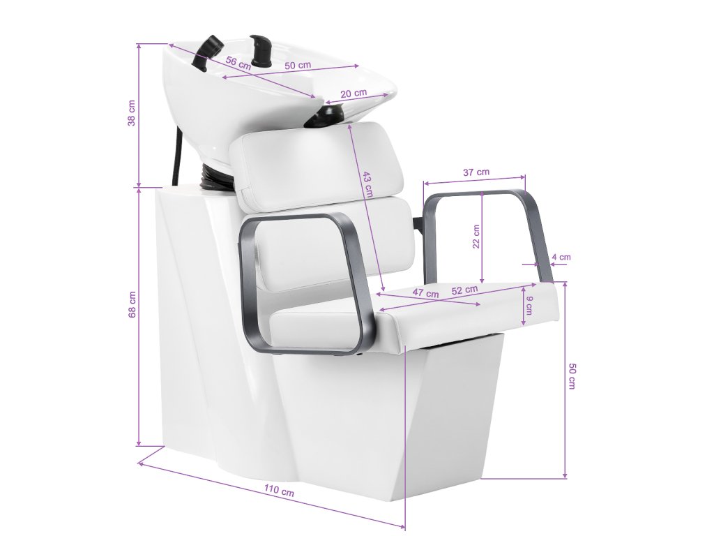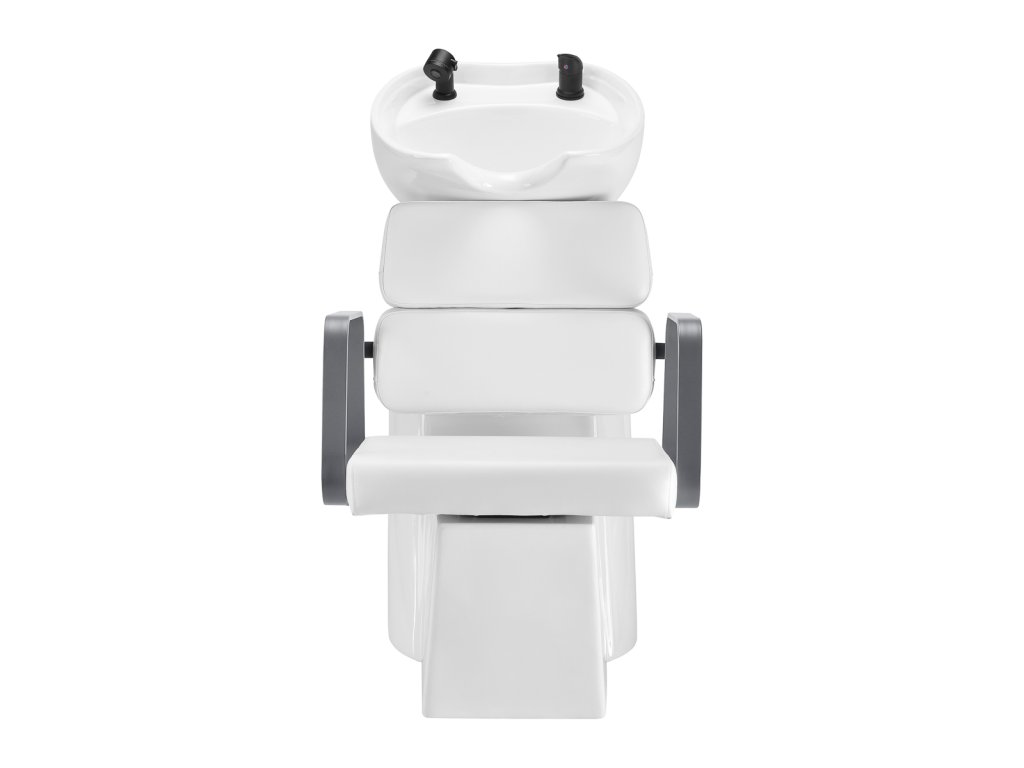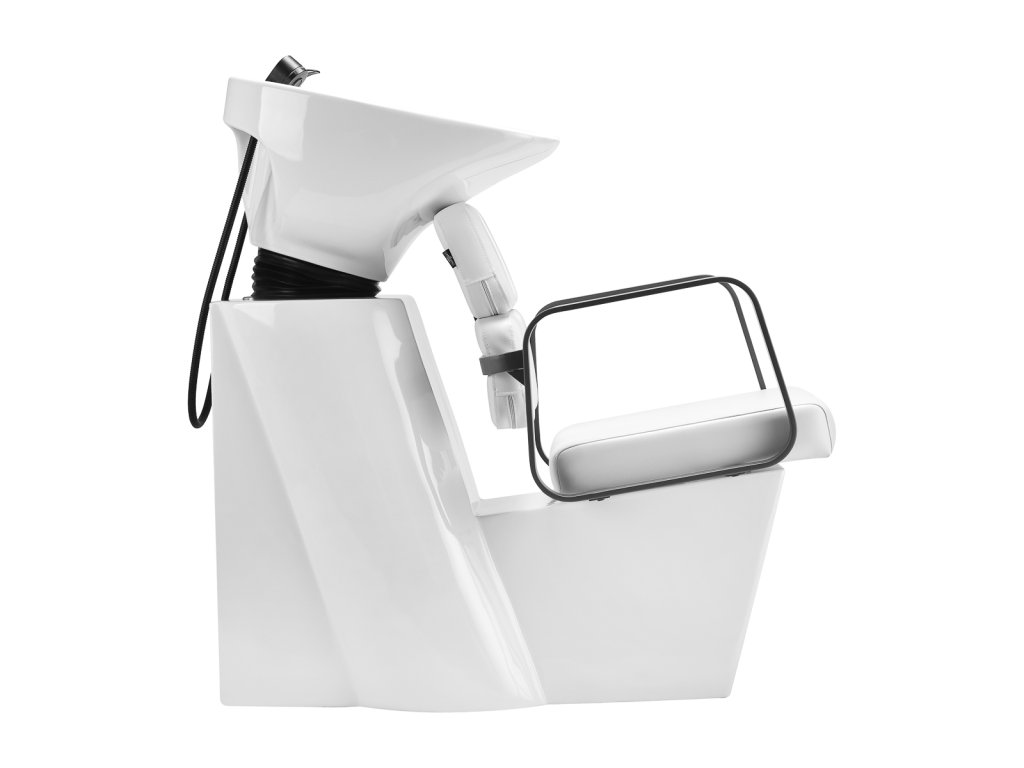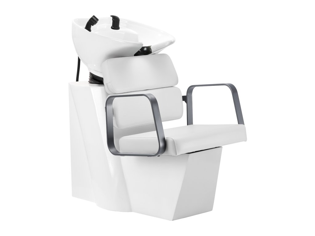 Profilovaná stoličkaposkytuje primeranú bedrovú oporu a tým aj vysoký komfort používania. Kovové podrúčky v odtieňoch gry s geometrickým tvarom umožňujúsprávna poloha ramien zákazníka. Výplň z trvanlivej peny odolnej voči deformácii a čalúnenie z na dotyk príjemnej syntetickej kože v odtieňoch bielej zabezpečujú odolnosť nábytku, jednoduché čistenie a pohodlné používanie po dlhú dobu. Originálny, elegantný vzhľad umývačky vlasov dodáva interiéru jedinečný výraz. Súprava obsahujekompletné príslušenstvo v čiernych odtieňoch, vrátane batérie, sprchovej hlavice a špeciálnych hadíc naposkytnúť kompletnú sadu pracovných nástrojov.