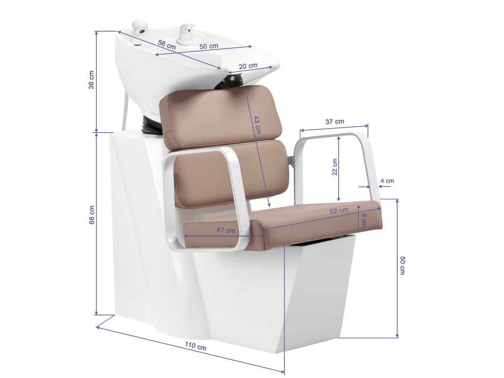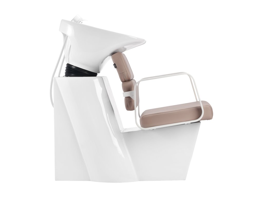 Profilovaná stoličkaposkytuje primeranú bedrovú oporu a tým aj vysoký komfort používania. Kovové podrúčky v odtieňoch bielej farby s geometrickým tvarom umožňujúsprávna poloha ramien zákazníka. Výplň z odolnej peny odolnej voči deformácii a čalúnenie z na dotyk príjemnej syntetickej kože v béžových odtieňoch zaručujú odolnosť nábytku, jednoduché čistenie a pohodlné používanie po dlhú dobu. Originálny, elegantný vzhľad umývačky vlasov dodáva interiéru jedinečný výraz. Súprava obsahujekompletné príslušenstvo v bielych odtieňoch, vrátane batérie, sprchovej hlavice a špeciálnych hadíc naposkytnúť kompletnú sadu pracovných nástrojov.