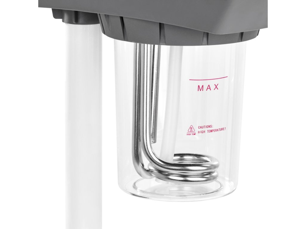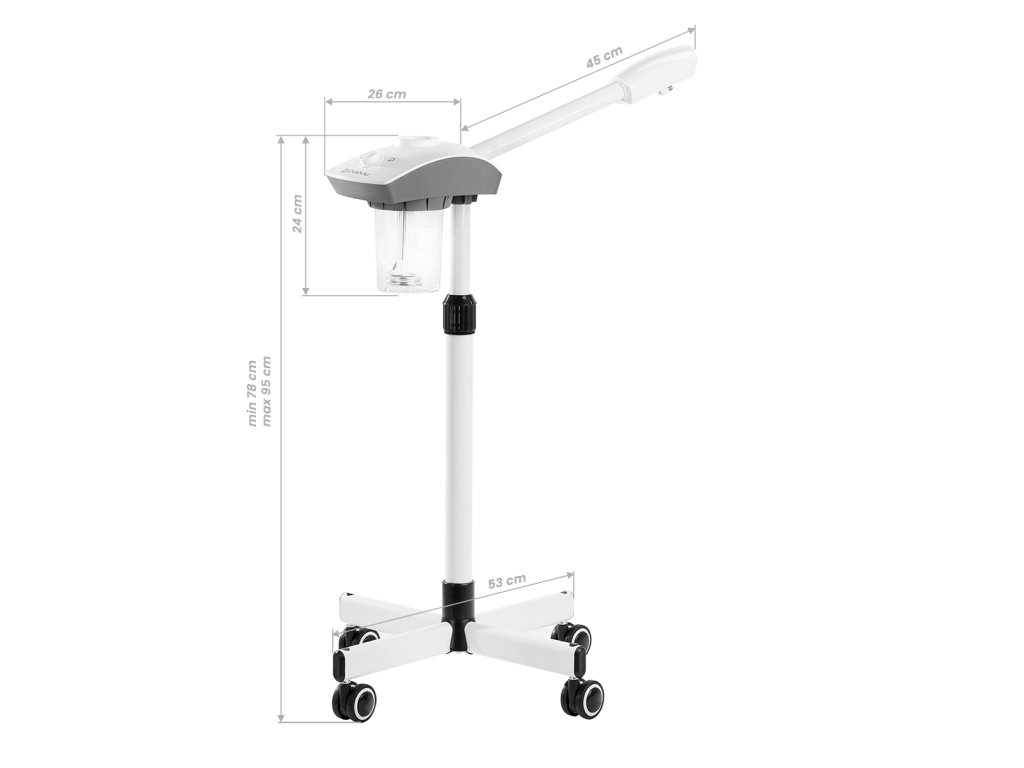 Vapozon je vyrobený z plastu v bielych odtieňoch, vďaka čomu je zariadenieľahko sa udržiava v čistote. Stojan je vybavený jednoduchým nastavením výškyv rozmedzí 78-95 cm, čo umožňuje umiestniť zariadenie na vhodnú úroveň, aby sa zabezpečil komfort práce pre osobu vykonávajúcu ošetrenie. Parná tryskamožno otáčať, čo zvyšuje rozsah možných nastavení. Štvorramenná základňa s pogumovanými kolieskamizlepšuje mobilitu, čo uľahčuje voľný pohyb zariadenia.