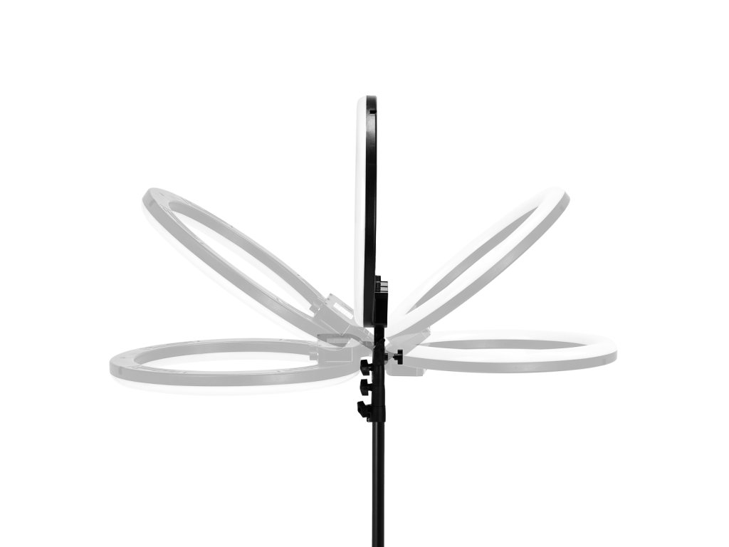 Vo vnútri krúžku lampy sa nachádzajúgombíky, ktoré umožňujú plynulé nastavenie teploty farieb v širokom rozsahu od 3000 do 6000 K,regulácia intenzity svetla v 12 úrovniacha farba svetla RGB. Diaľkové ovládanie umožňuje meniť svetlo na diaľku. Tieto funkcie poskytujú dodatočnú flexibilitu pri používaní lampy. Upevnenie na pevný statívzaručuje pohodlnú prácu v kozmetickom salóne, tetovacom štúdiu alebo doma. Okrem toho sa vo vnútri krúžku lampy nachádzajú tri adaptéry so závitomumožňuje inštaláciu flexibilného držiak telefónu, ktorá je súčasťou súpravy a ktorá umožňuje predĺženie svorky na maximálne 15 cm - je vhodná pre väčšinu smartfónov dostupných na trhu.Vstup USB umiestnený na zadnej strane krúžku lampy umožňuje pripojiť telefón na nabíjanie počas používania.