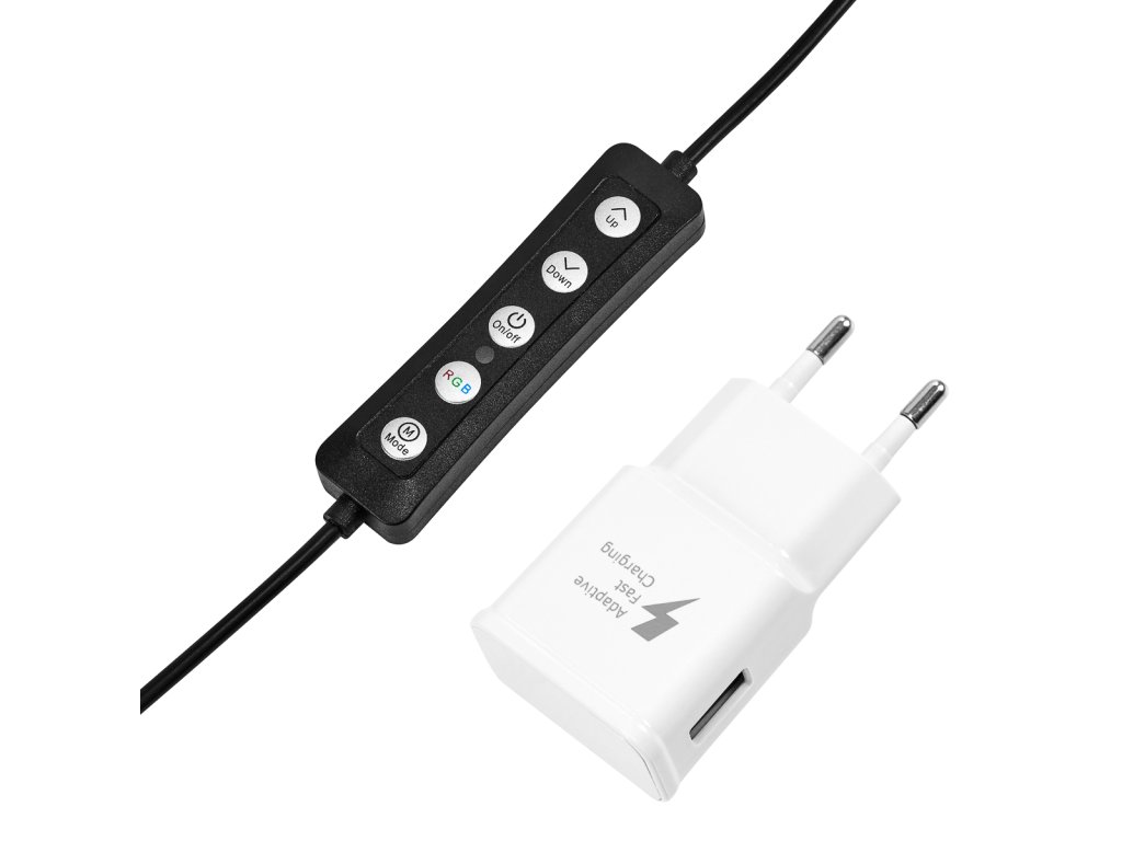 Súprava obsahuje: krúžkové svetlo, napájací kábel USB, nabíjačka, prvky statívu, návod, držiak na telefón.