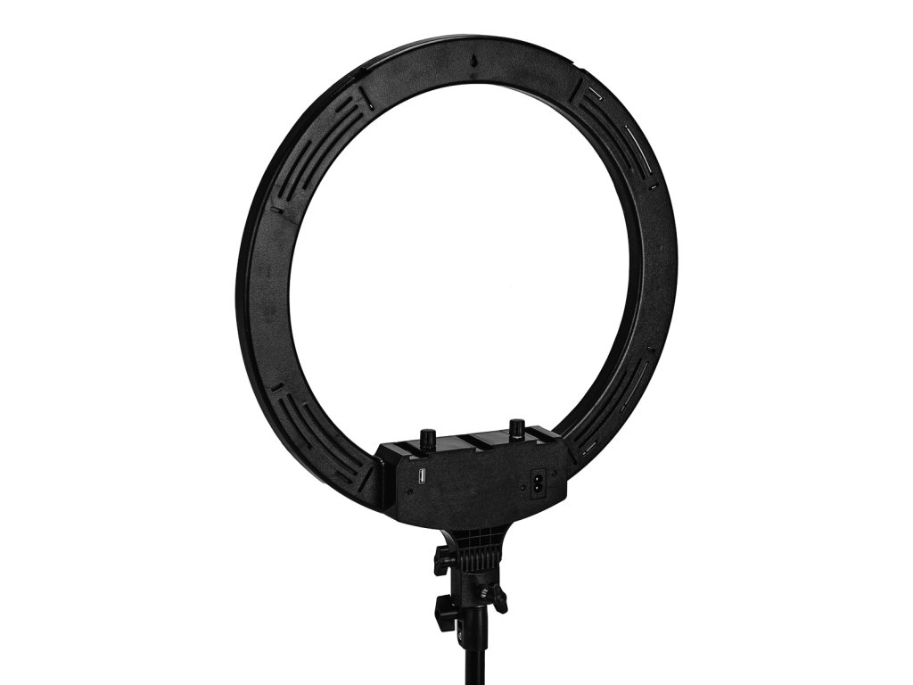 Veľký priemer krúžku lampy umožňuješiroký, mimoriadne rozptýlený a jemný svetelný prúd. Ľahká a odolná konštrukcia statívu s protišmykovými nožičkami zabezpečuje výrazný komfort a stabilitu počas používania. Teleskopický rám umožňuje uzamknúť výškuv rozsahu 40-210 cm, čo uľahčuje nastavenie osvetlenia podľa vašich potrieb. Malá guľová hlava, ktorá je súčasťou súpravy, umožňuje jednoduchú inštaláciu lampy a voľné nastavenie jeho uhla.