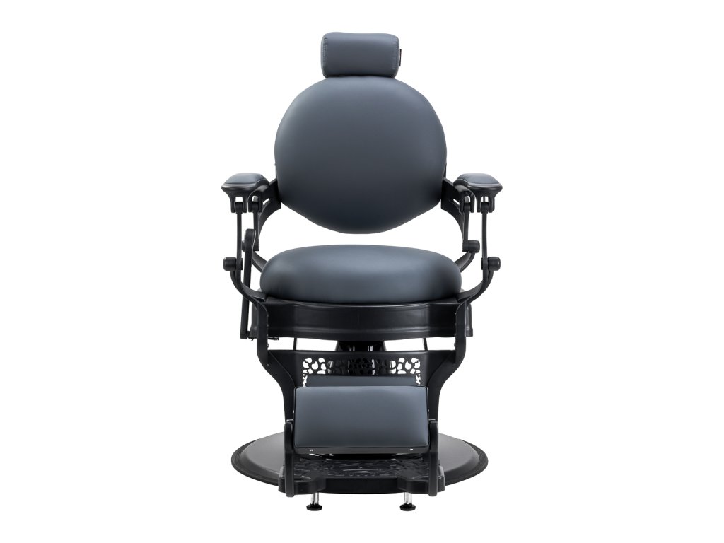 Pevná základná konštrukcia zaručuje stabilitu a vysoký komfort používania. Výplň sedadla z trvanlivej peny odolnej proti deformácii a čalúnenie z na dotyk príjemnej syntetickej kože s matnou povrchovou úpravou zaručujúdlhodobá životnosť a pohodlné používanie nábytku. Vďaka použitým materiálom je zariadenieodolné voči vlhkosti, trvanlivé a ľahko sa čistia. Poťah v odtieňoch grafitovej farby spolu so zdobenou podnožkou mu dodáva jedinečný charakter. Stolička so svojímvýrazný dizajn odkazujúce na vintage štýl, dokonale zapadajú do atmosféry holičstiev a umocňujú ich jedinečnú atmosféru.