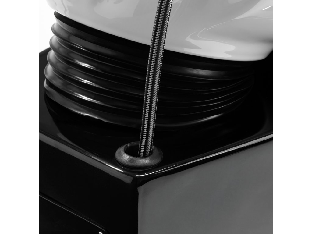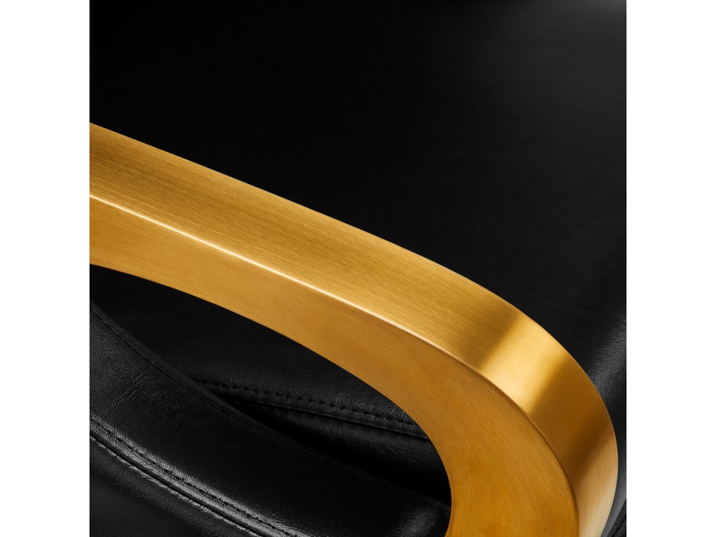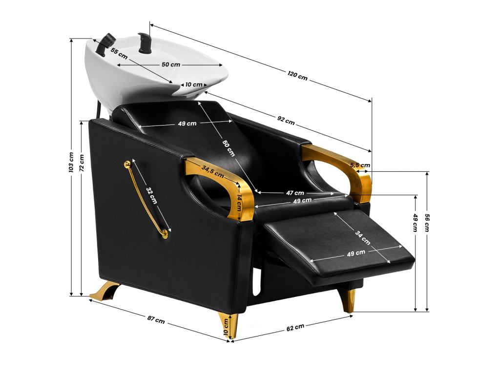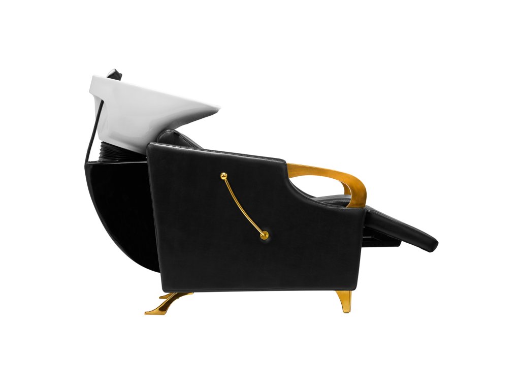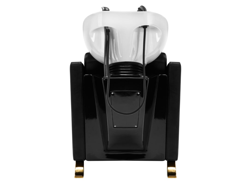 Tvarovaná stolička vyplnená odolnou penou poskytujeprimeraná bedrová opierka a tým aj vysoký komfort používania. Podrúčky s prvkami v odtieňoch zlatej farby umožňujúsprávna poloha ramien zákazníka. Na dotyk príjemný poťah zo syntetickej kože v odtieňoch čiernej zaručujedlhodobá životnosť a jednoduché čistenie. Elegantný vzhľad umývačky vlasov dodáva interiéru jedinečný výraz. Nohy a páka v odtieňoch zlatej farbydodať stabilitu a jemne zdôrazniť štýlový charakter umývačky vlasov. Súprava obsahujekompletné príslušenstvo v odtieňoch čiernej farby, vrátane batérie, sprchovej rukoväte a vyhradených hadíc, ktoré poskytujú kompletnú sadu nástrojov pre prácu kaderníka.