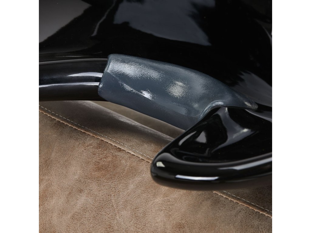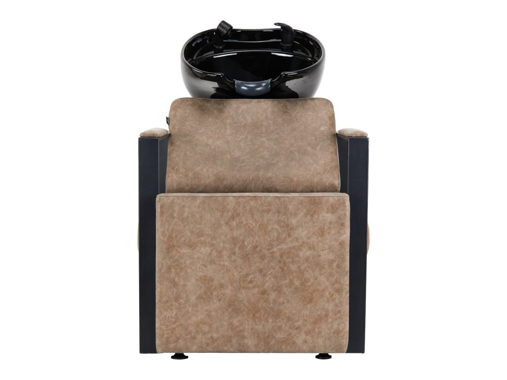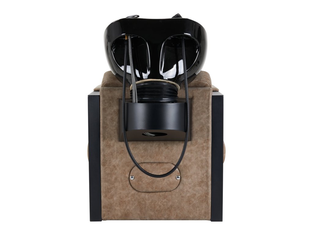 Správne profilovaná stolička vyplnené odolnou penou zaisťujú vysoký komfort používania a geometrické, čiastočne čalúnené podrúčky umožňujúpre správne umiestnenie ramien klienta. Operadlo je umiestnené v optimálnom uhle a poskytuje vynikajúcu oporu chrbtici. Poťah zo syntetickej kože v odtieňoch hnedej farby zaručuje dlhodobú trvanlivosť a jednoduché čistenie. Originálny, elegantný vzhľad umývania dodáva interiéru jedinečný výraz. Stabilizačné nožičky dodávajú stabilitu a jemne zdôrazňujú štýlový charakter kaderníckej umývacej jednotky. Súprava obsahuje kompletné príslušenstvo s matnou povrchovou úpravou v odtieňoch čiernej farby vrátane batérie, sprchovej hlavice a vyhradených hadíc, ktoré poskytujúkompletnú sadu pracovných nástrojov.
