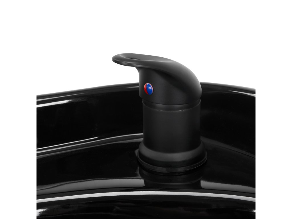 Hĺbkakeramická misa na umývadlo v odtieňoch čiernej,zabraňuje nadmernému striekaniu vody a produkty používané počas liečby. To umožňujepohodlné a efektívne vykonávanie širokej škály kaderníckych služieb. Mobilita misy umožňuje jednoduché prispôsobenie uhla sklonu individuálnym potrebám. Vďaka použitému materiálu je umývadlotrvanlivé, odolné voči zmene farby a poškriabaniu a veľmi ľahko sa udržiavajú v čistote. Správne profilovaný golier zabezpečujeoptimálna podpora a pohodlie pri umývaní vlasov a pohodlný kryt z plastu v odtieňoch čiernej farby spôsobuje, že zákazník nebude cítiť žiadne nepohodlie spojené s chladom keramického povrchu.