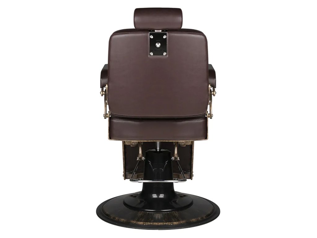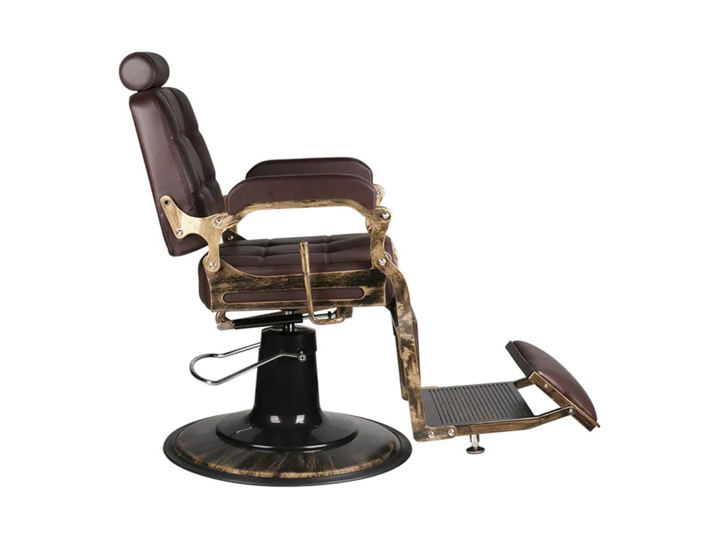 Kadernícke kreslo v retro štýle zaujme svojím elegantným dizajnom inšpirovaným klasickým automobilovým priemyslom. Pevná, okrúhla základňazaručuje stabilitu a pohodlie pri používaní. Sedadlo vyplnené penou odolnou proti deformácii a čalúnené syntetickou kožou príjemnou na dotykzaručuje pohodlie a trvanlivosť na dlhé roky. Vďaka použitým materiálom je zariadenieodolné voči vlhkosti a ľahko sa čistia. Prešívané čalúnenie v hnedom odtieni,vyrobené s dôrazom na detailzdôrazňuje luxusný charakter nábytku. Štylizované kovové podrúčky a rám v zlatom odtienidodať celému projektu jedinečný charakter.