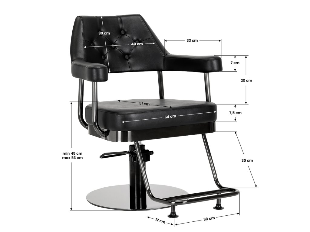 Odolný hydraulický výťah umožňuje nastaviť výšku v rozmedzí 45-53 cm, aj keď zákazník sedí na stoličke. To zaručuje viacergonomická práca, vďakamožnosť voľného nastavenia úrovne sedadla na výšku klienta aj kaderníka.Profilované operadlo, zdobený prešívaním s vhodnými gombíkmi, umožňuje zaujať pohodlnú polohu. Tentoposkytuje primeranú oporu chrbta, čo je dôležité najmä pri ošetreniach trvajúcich mnoho hodín. Veľkým plusom je aj vizuálne zaujímavýjemný otvor medzi operadlom a sedadlom. Uľahčuje udržiavanie čistoty v salóne a umožňuje vám ľahko vymetať vlasy z každého zákutia kresla,úspora času pri príprave pracovnej stanice medzi klientmi.