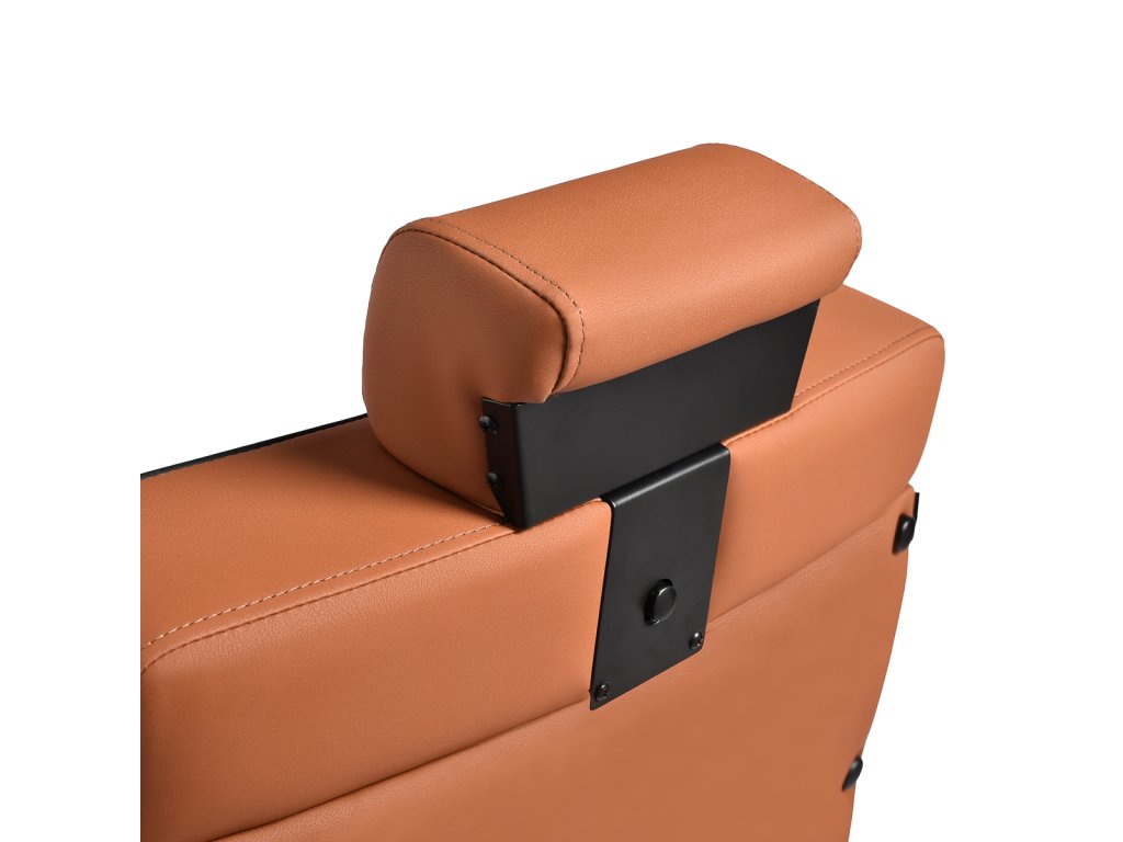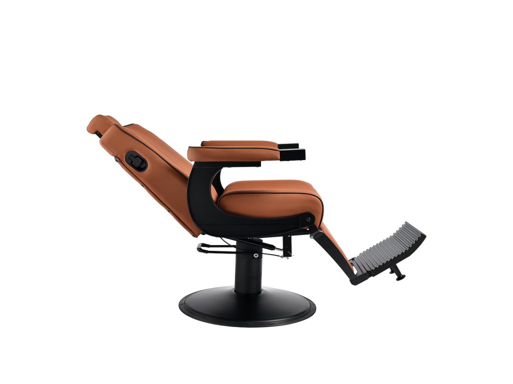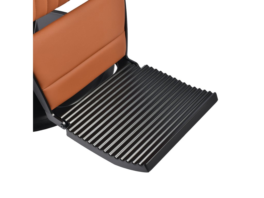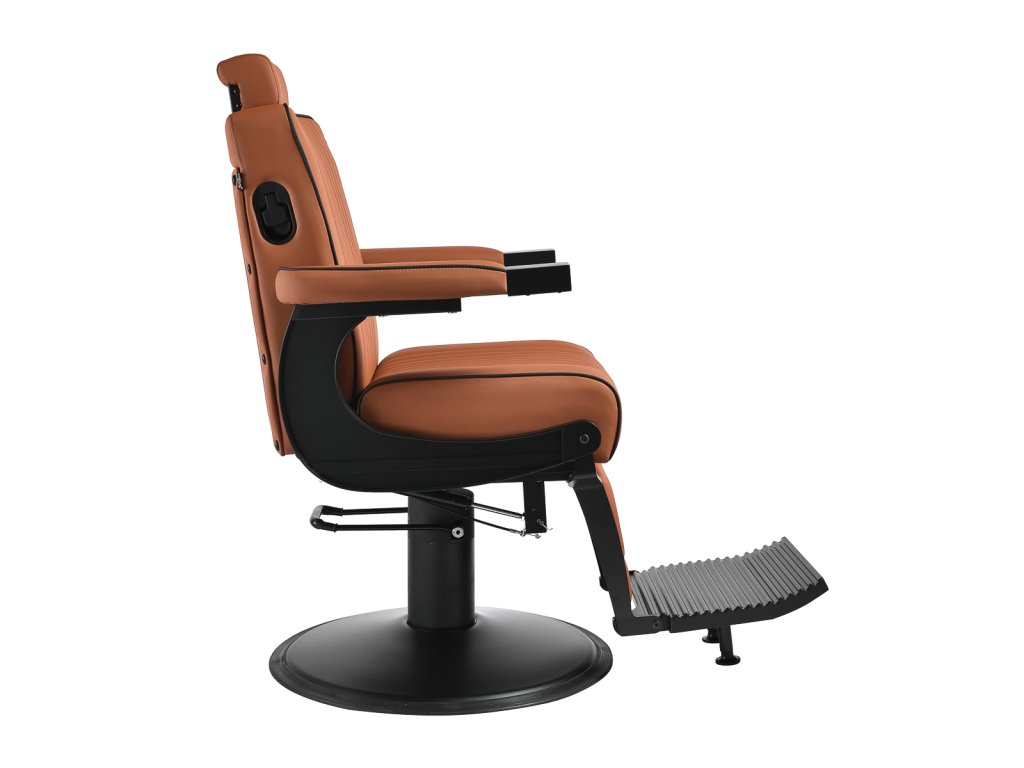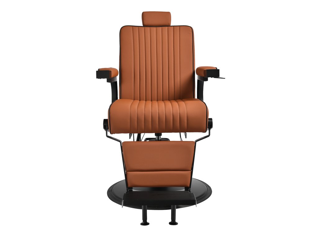 Čierna okrúhla základňa zaručuje stabilitu a odolnosť. Mäkké matné čalúnenie zo syntetickej kože spája pohodlie s odolnosťou. Použité materiály súodolnosť voči vlhkosti, odolné a ľahko sa čistia. Štýlové prešívanie a čalúnenie v hnedom odtieni mu dodávajú jedinečný charakter,dokonale dopĺňa dekor moderných holičstiev. Kombinácia elegantnej farby čalúnenia s čiernym rámom a podstavcomzdôrazňuje moderný, profesionálny vzhľad stoličky.