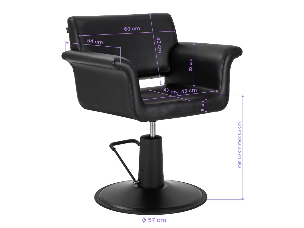 Robustný hydraulický zdvihák umožňuje plynulé nastavenie výšky sedadlaod 50 do 65 cm - aj keď klient sedí. Vďaka tomu je možné polohu ľahko prispôsobiť výške klienta aj stylistu, čopodporuje ergonomické držanie tela počas práce. Pohodlné operadlo poskytuje stabilná opora chrbta, čo zaručuje pohodlie aj počas dlhých procedúr.Mechanizmus úplného otáčania zvyšuje voľnosť pohybu a umožňuje ľahký prístup ku klientovi zo všetkých strán.