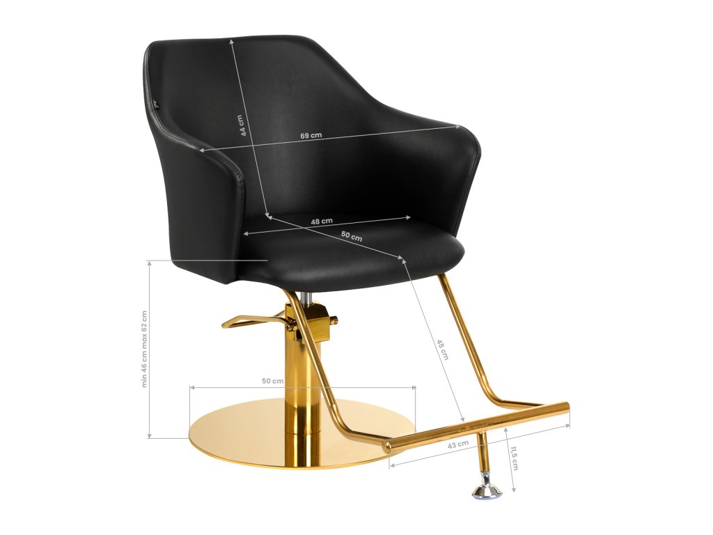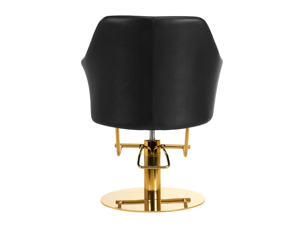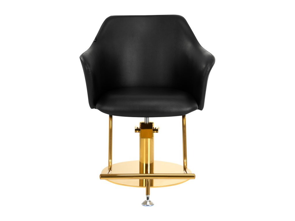 Okrúhla, pevná základňa zaručuje stabilitu počas používania. Hladký povrch so zrkadlovou úpravou dodáva prvku elegantný vzhľad a umožňujeľahko sa udržiava v čistote. Pohodlné sedadlo s penovou výplňou zaručujevysoký komfort používania, a to aj počas mnohých hodín liečby. Významnou výhodou jepodnožka v zlatých tónoch určená pre tento model, ktorá poskytuje stabilnú oporu pre nohy používateľa a dodáva nábytku štýlový vzhľad. Podrúčkyumožniť správnu polohu ramien klienta - To im zabraňuje zaboriť hlavu do ramien alebo sa hrbiť, čo uľahčuje presné ošetrenie, napríklad strihanie vlasov.