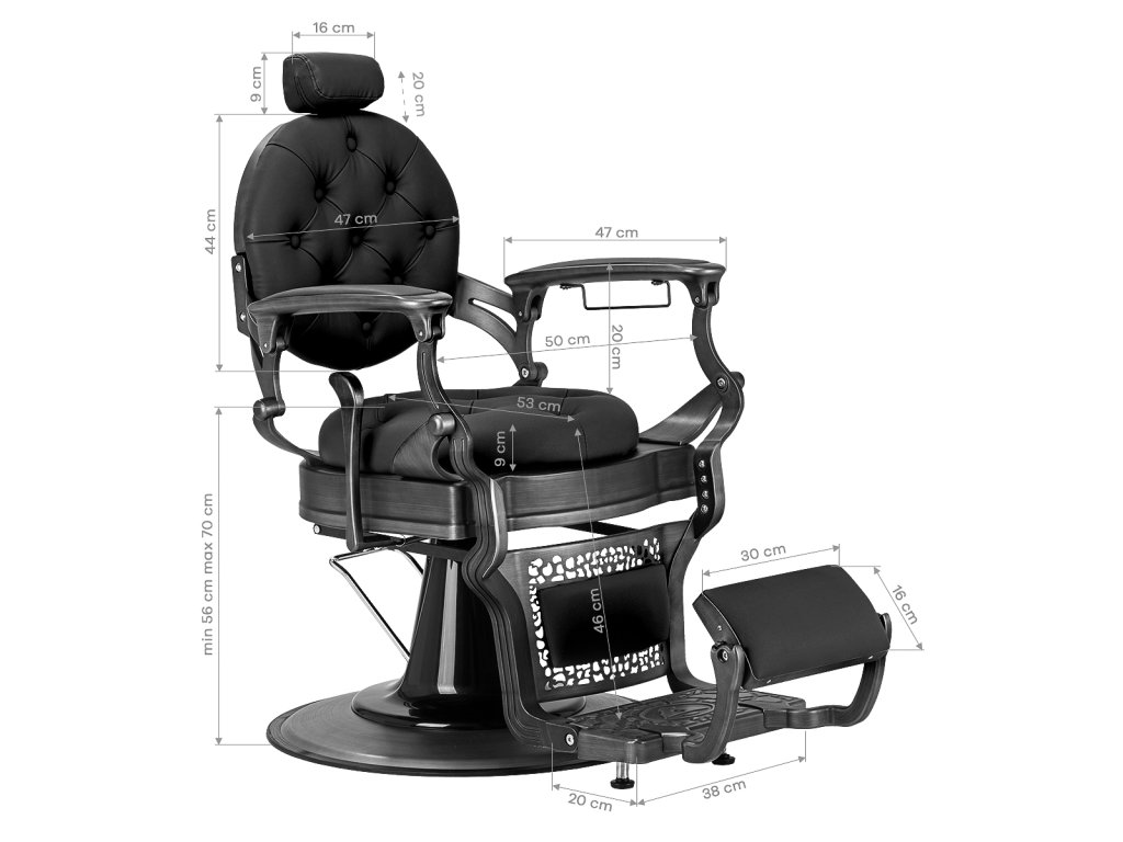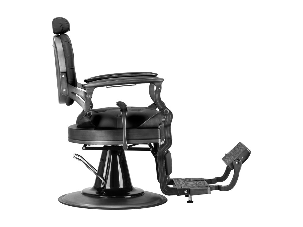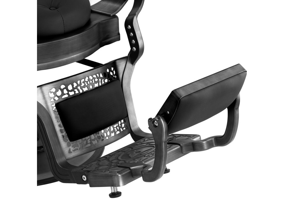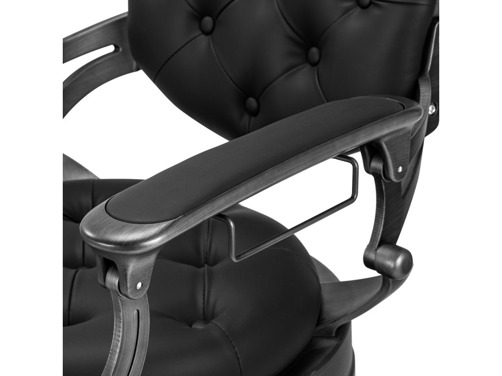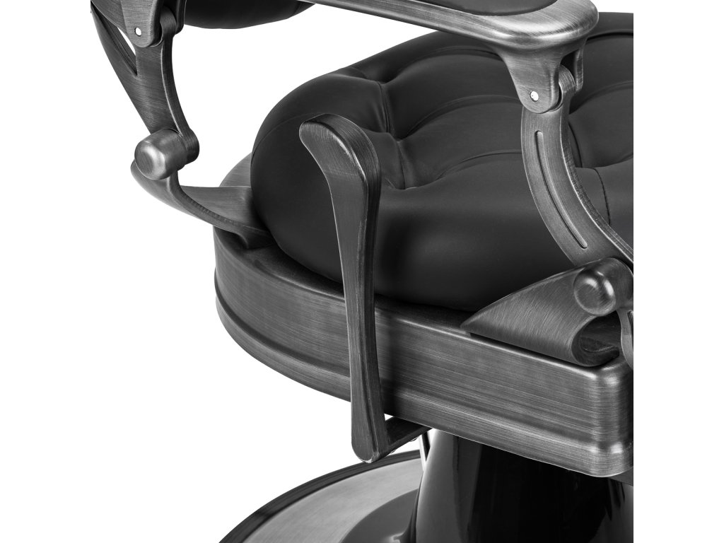 Pevná základná konštrukcia zaručuje stabilitu a vysoký komfort používania. Výplň sedadla z trvanlivej peny odolnej proti deformácii a čalúnenie z na dotyk príjemnej syntetickej kože s matnou povrchovou úpravou zaručujúdlhodobá životnosť a pohodlné používanie nábytku. Vďaka použitým materiálom je zariadenieodolné voči vlhkosti, trvanlivé a ľahko sa čistia. Poťah v odtieňoch čiernej farby s prešívaním a ozdobnými gombíkmi spolu so zdobenou podnožkou mu dodáva jedinečný charakter. Kreslo svýrazný dizajn odkazujúce na vintage štýl, dokonale zapadajú do atmosféry holičstiev a umocňujú ich jedinečnú atmosféru.