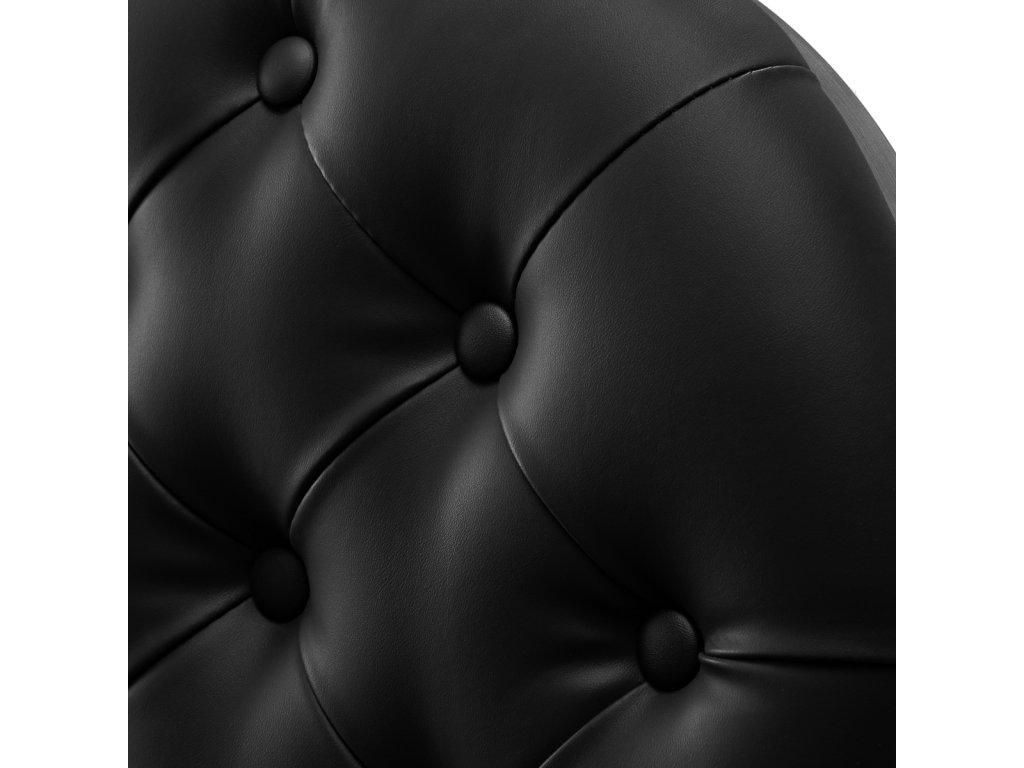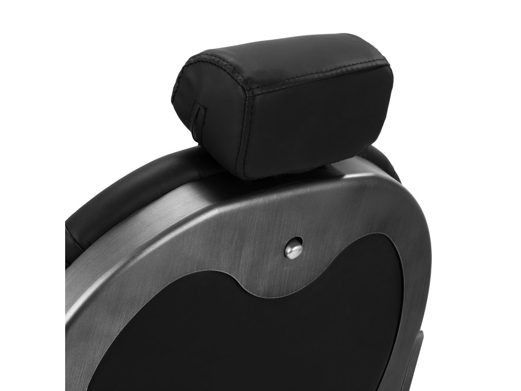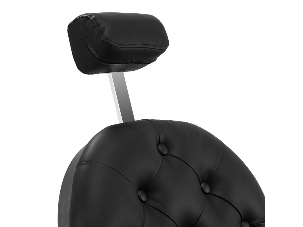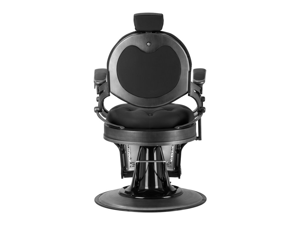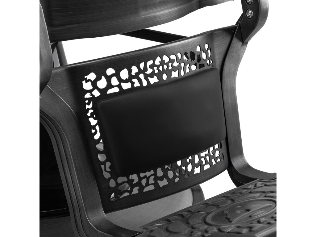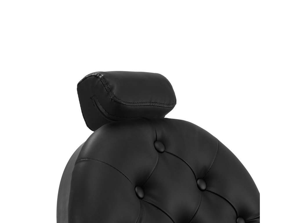 Pevná základná konštrukcia zaručuje stabilitu a vysoký komfort používania. Výplň sedadla z trvanlivej peny odolnej proti deformácii a čalúnenie z na dotyk príjemnej syntetickej kože s matnou povrchovou úpravou zaručujúdlhodobá životnosť a pohodlné používanie nábytku. Vďaka použitým materiálom je zariadenieodolné voči vlhkosti, trvanlivé a ľahko sa čistia. Poťah v odtieňoch čiernej farby s prešívaním a ozdobnými gombíkmi spolu so zdobenou podnožkou mu dodáva jedinečný charakter. Kreslo svýrazný dizajn odkazujúce na vintage štýl, dokonale zapadajú do atmosféry holičstiev a umocňujú ich jedinečnú atmosféru.