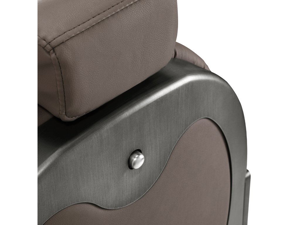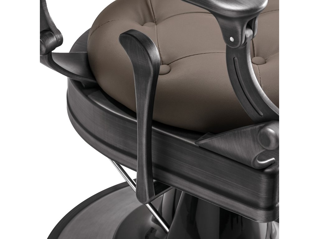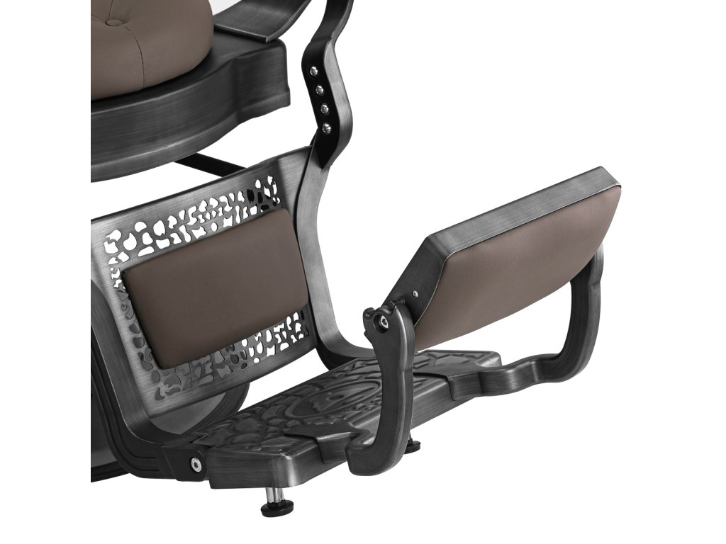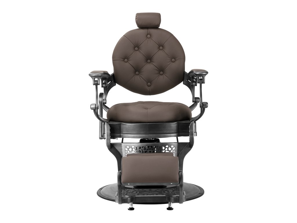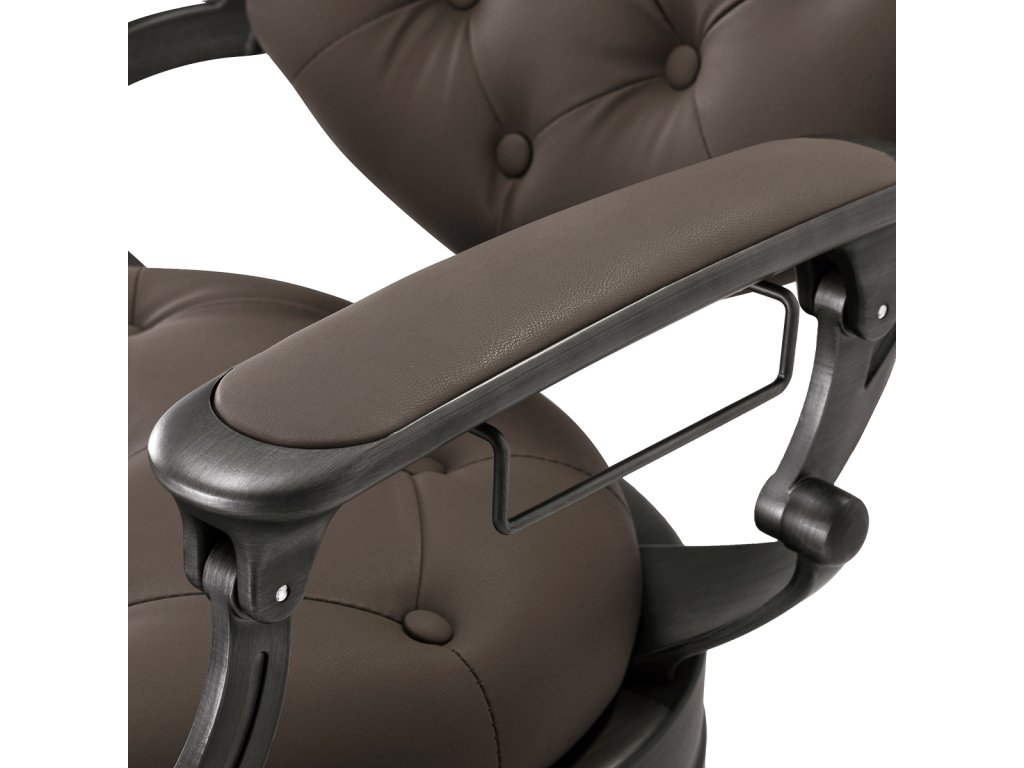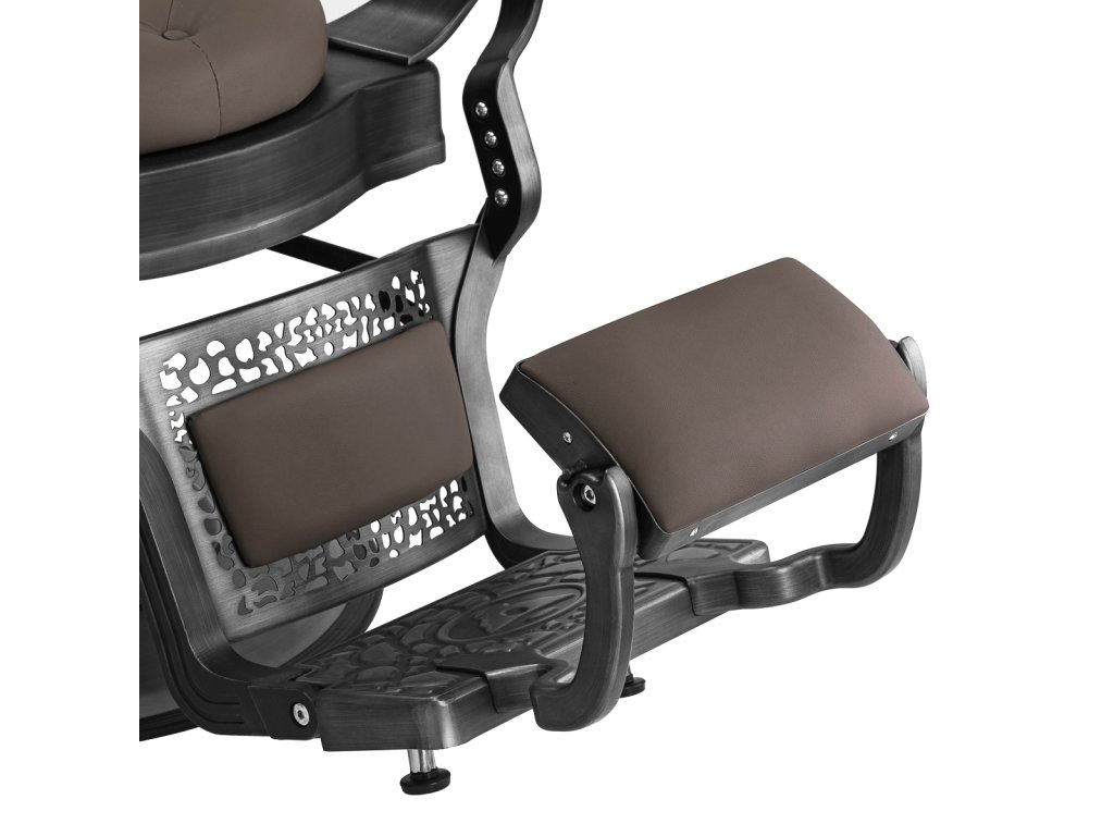 Pevná základná konštrukcia zaručuje stabilitu a vysoký komfort používania. Výplň sedadla z trvanlivej peny odolnej proti deformácii a čalúnenie z na dotyk príjemnej syntetickej kože s matnou povrchovou úpravou zaručujúdlhodobá životnosť a pohodlné používanie nábytku. Vďaka použitým materiálom je zariadenieodolné voči vlhkosti, trvanlivé a ľahko sa čistia. Poťah v odtieňoch hnedej farby s prešívaním a ozdobnými gombíkmi spolu so zdobenou podnožkou mu dodáva jedinečný charakter. Kreslo s výrazným dizajnom odkazujúcim na vintage štýl dokonale zapadá do atmosféry holičstiev a umocňuje ich jedinečnú atmosféru.