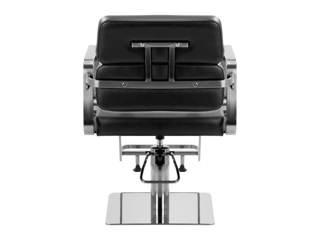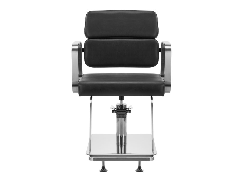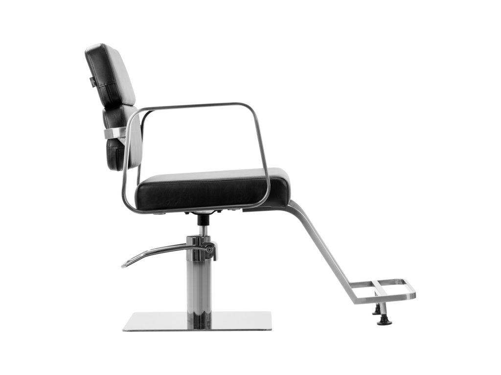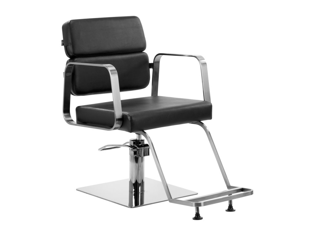 Mechanizmus úplného otáčania stoličky robí prácu kaderníkaefektívnejšie a pohodlnejšie. Pevná, plochá základňa štvorcového tvaruzaručuje stabilitu počas používania. Hladký povrch s matnou povrchovou úpravou dodáva prvku elegantný vzhľad a umožňuje ľahko sa udržiava v čistote. Pohodlné sedadlo s penovou výplňou zaručujevysoký komfort používania, a to aj počas mnohých hodín liečby. Geometrické kovové opierky rúk umožňujúsprávna poloha ramien klienta - to znamená, že nezakrýva hlavu do ramien a nehrbí sa - čouľahčuje presné ošetrenie, vrátane strihania vlasov. Štýlová opierka na nohy určená pre tento model poskytuje stabilnú oporu pre nohy používateľa.