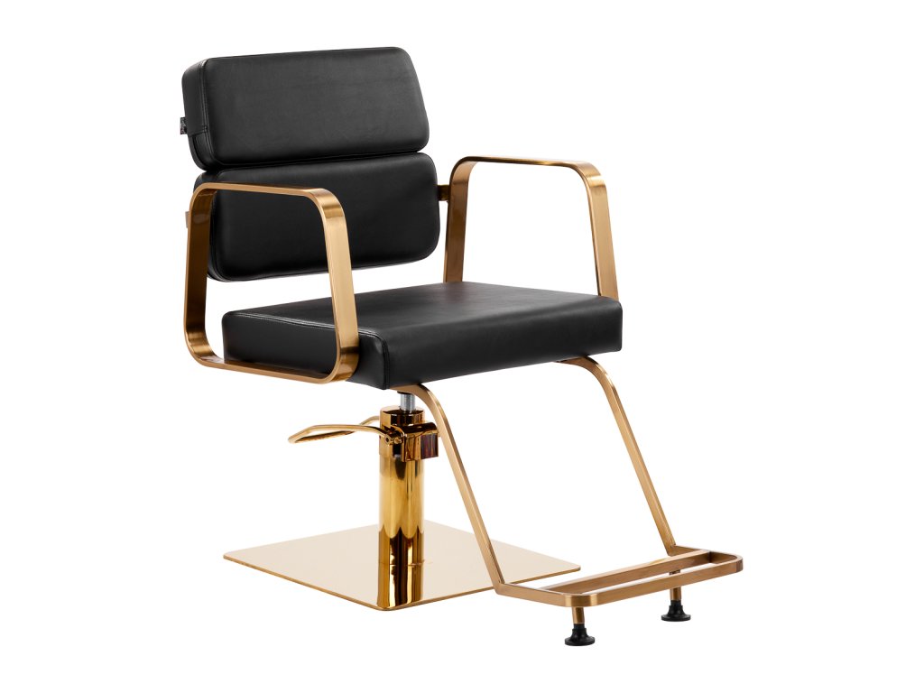 Mechanizmus úplného otáčania stoličky robí prácu kaderníkaefektívnejšie a pohodlnejšie. Pevná, plochá základňa štvorcového tvaruzaručuje stabilitu počas používania. Hladký povrch s matnou povrchovou úpravou dodáva prvku elegantný vzhľad a umožňuje ľahko sa udržiava v čistote. Pohodlné sedadlo s penovou výplňou zaručujevysoký komfort používania, a to aj počas mnohých hodín liečby. Geometrické kovové podrúčky v odtieňoch zlatej farby umožňujúsprávna poloha ramien klienta - to znamená, že nezakrýva hlavu do ramien a nehrbí sa - čouľahčuje presné ošetrenie, vrátane strihania vlasov. Štýlová opierka na nohy určená pre tento model poskytuje stabilnú oporu pre nohy používateľa.