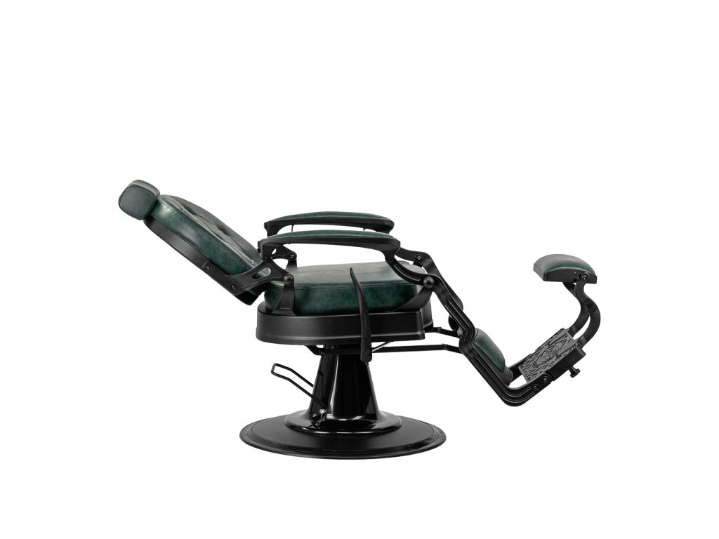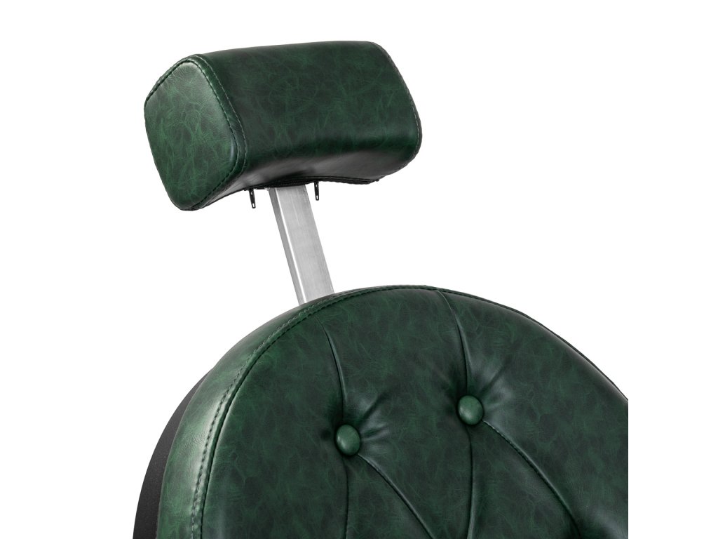 Pevná konštrukcia základne zaručuje stabilitu a vysoký komfort používania. Výplň sedadla je vyrobená z odolnej peny odolnej proti deformácii a čalúnenie je z príjemnej na dotyk syntetickej kože s polomatnou povrchovou úpravou, ktorá zabezpečujeodolnosť nábytku a jeho pohodlné používanie počas dlhého obdobia. Vyrábajú tiež zariadeniaodolné voči vlhkosti, trvanlivé a ľahko sa čistia. Poťah v zelených odtieňoch s prešívaním a ozdobnými gombíkmi mu dodáva jedinečný charakter. Kreslo s charakteristickým dizajnom,s odkazom na vintage štýl, dokonale zapadá do atmosféry holičstiev a podčiarkuje ich jedinečnú atmosféru.