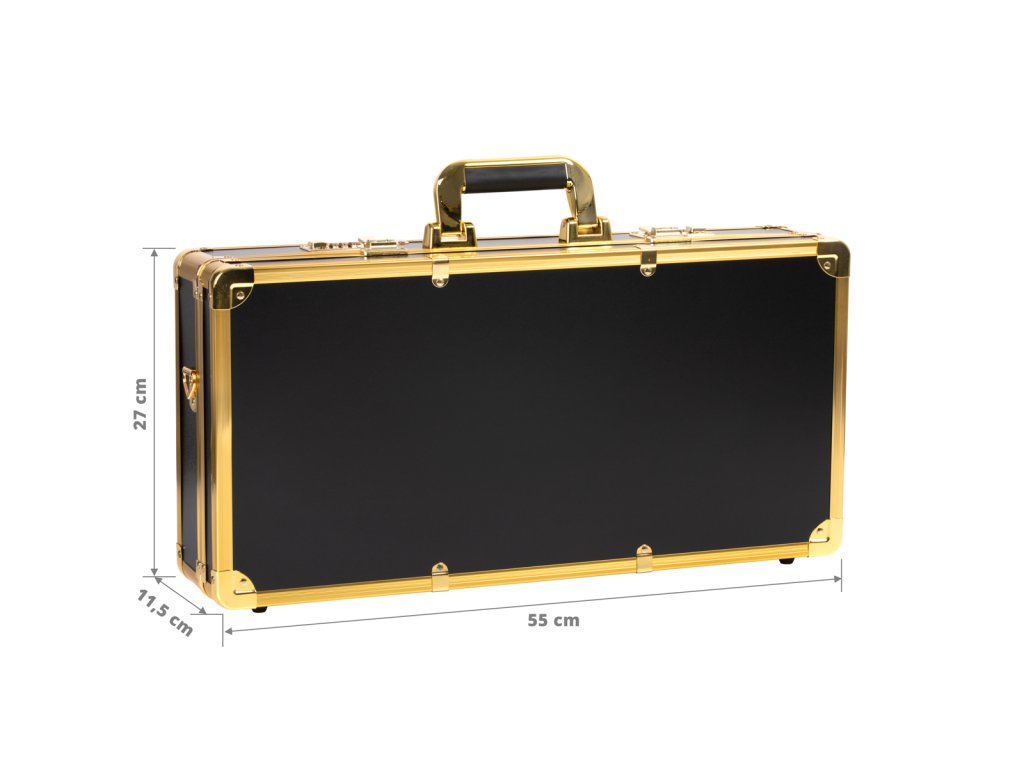 Hliníkový holičský kufor s dvojitým kombinačným zámkom a pohodlnou rukoväťou. Do kufríka sa zmestia rôzne doplnky a kadernícke nástroje - nožnice, hrebene, kefy na vlasy, fén, strihacie strojčeky atď. Kufrík sa dodáva s odnímateľným ramenným popruhom.