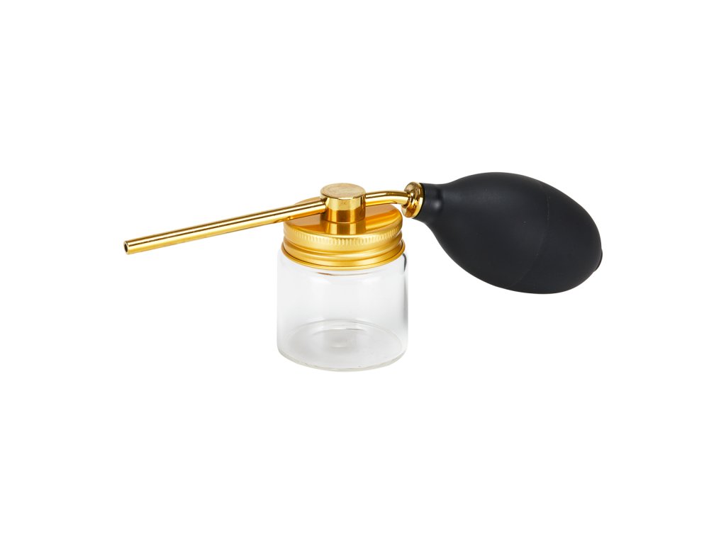 Štýlový rozprašovač s gumovou žiarovkou umožňuje rýchlo a pohodlne naniesť na pokožku mastenec, ktorý neutralizuje prebytočný pot, zabraňuje podráždeniu pokožky a výrazne uľahčuje odstraňovanie zvyškov vlasov po strihaní.Nádrž zo sklaje spojený so žiarovkou pomocou kovového prvku v zlatých odtieňoch. Fľaša s rozprašovačom jekompaktný a ľahký, čo z neho robí ideálny nástroj pre profesionálnych holičov aj pre domáce použitie.