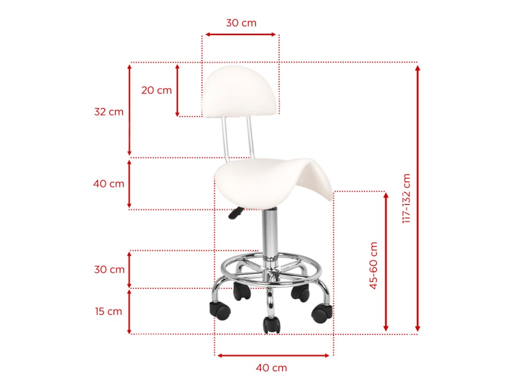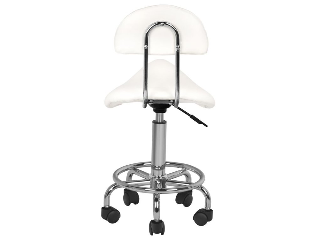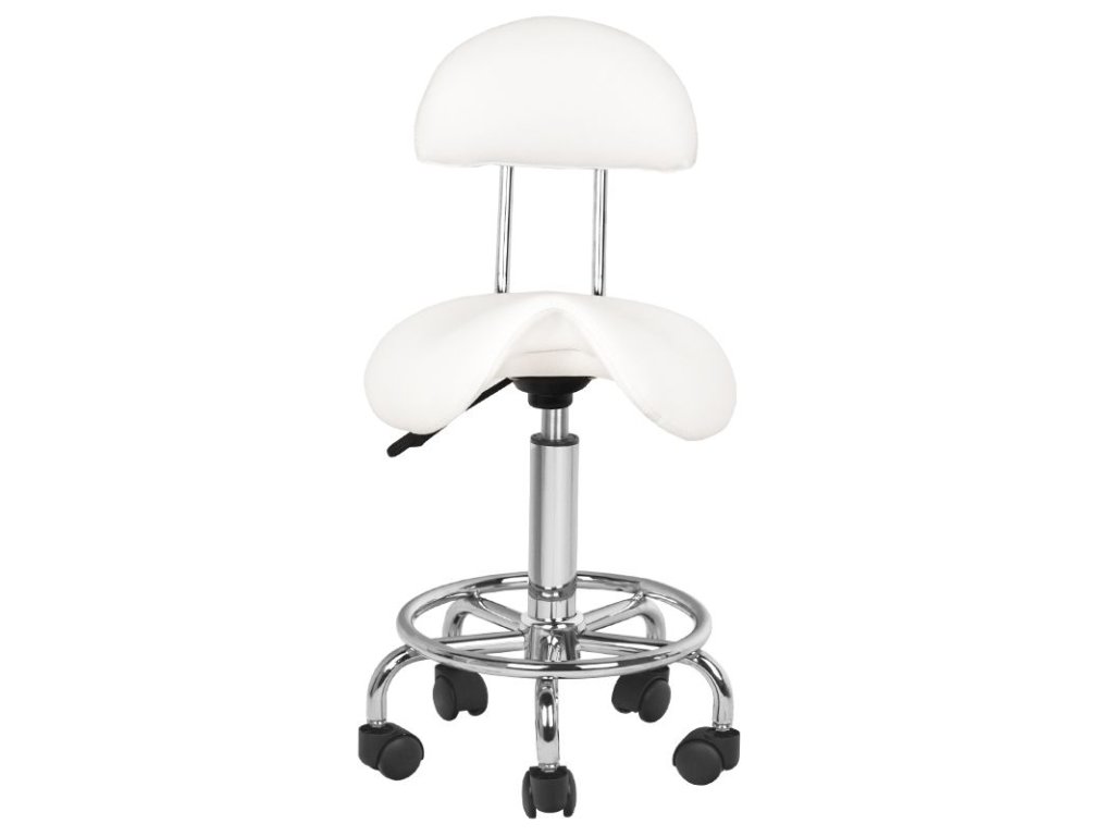 pohodlná, stabilná kozmetická stolička s operadlom, s profilovaným sedadlom, na päťhviezdičkovej základni s plastovými kolieskami. k dispozícii v bielej farbe, nevyhnutný kus nábytku v kozmetickom salóne.