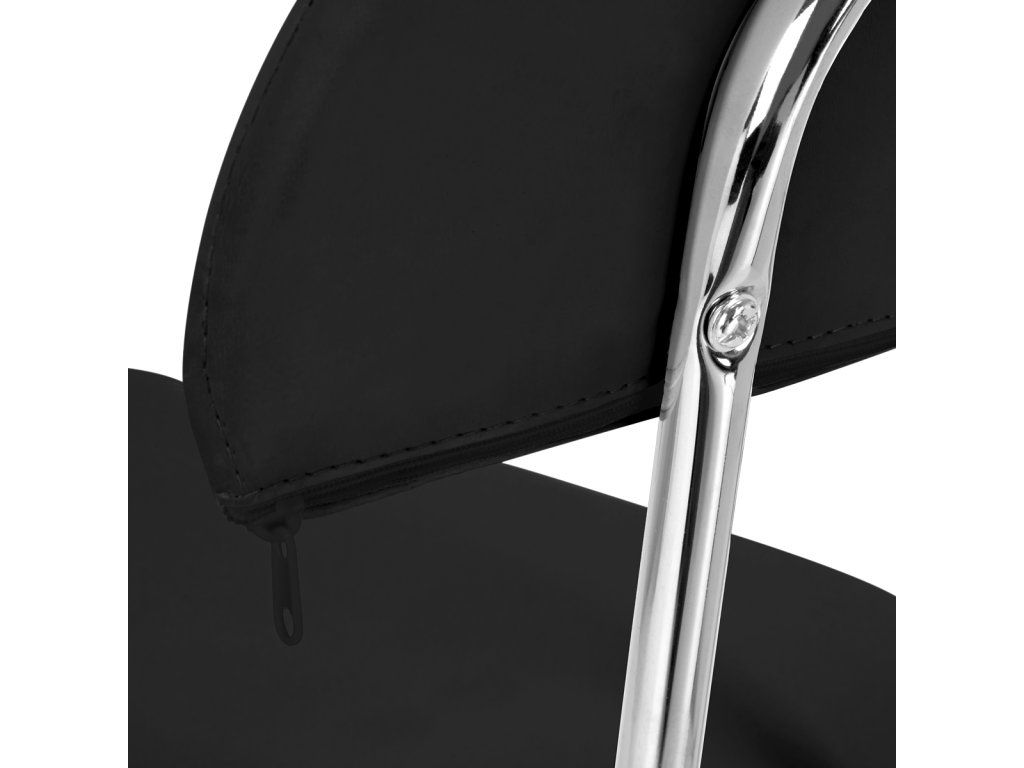 Päťhviezdičková základňa v odtieňoch chrómu je vybavená kolesami, ktorézabezpečiť významnú mobilitu, čo uľahčuje premiestňovanie nábytku po salóne. Čalúnenie stoličky je vyrobené z imitácie kože príjemnej na dotyk v odtieňoch čiernej farby. Vďaka použitiu takéhoto materiálu je stoličkatrvanlivé, odolné voči vlhkosti a ľahko sa čistia.