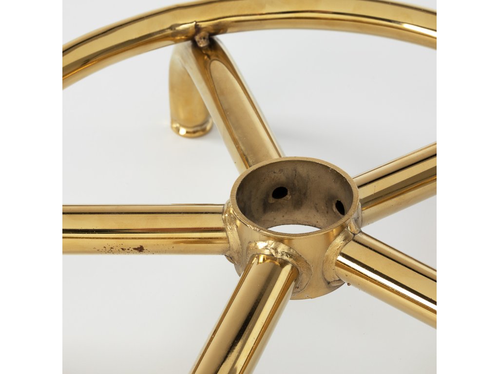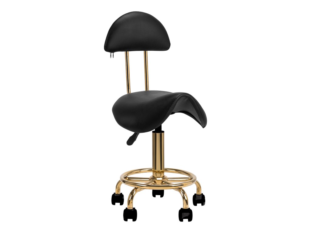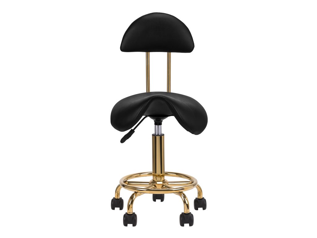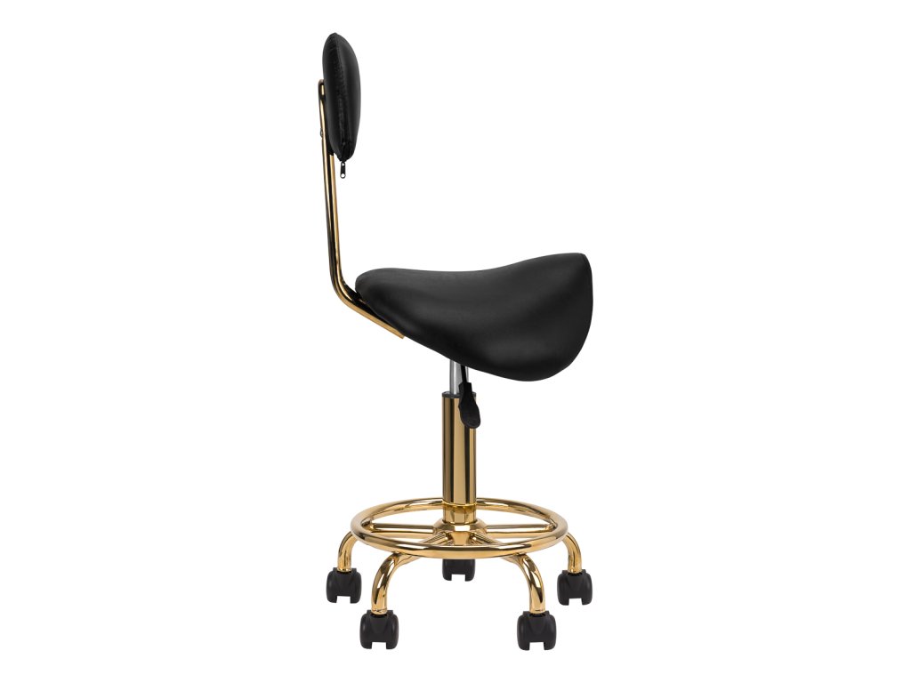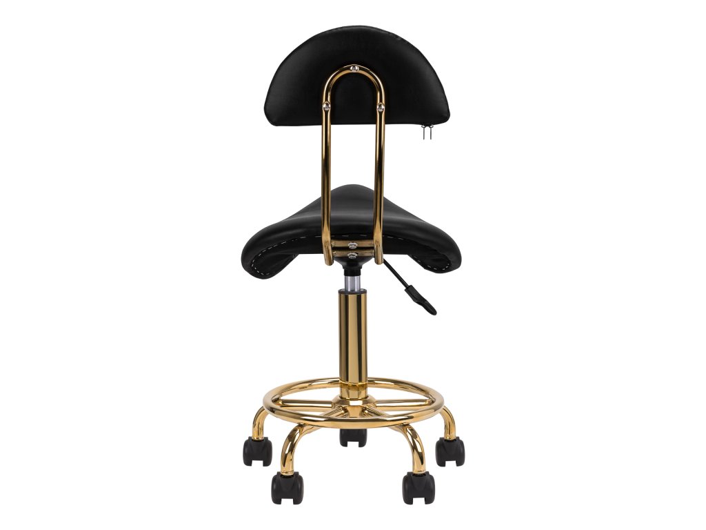 Päťhviezdičková základňa v zlatých odtieňoch je vybavená kolesami, ktorézabezpečiť významnú mobilitu, čo uľahčuje premiestňovanie nábytku po salóne. Čalúnenie stoličky je vyrobené z imitácie kože príjemnej na dotyk v odtieňoch čiernej farby. Vďaka použitiu takéhoto materiálu je stoličkatrvanlivé, odolné voči vlhkosti a ľahko sa čistia.