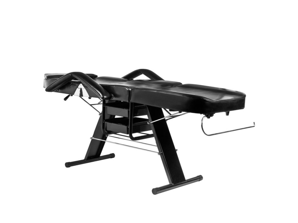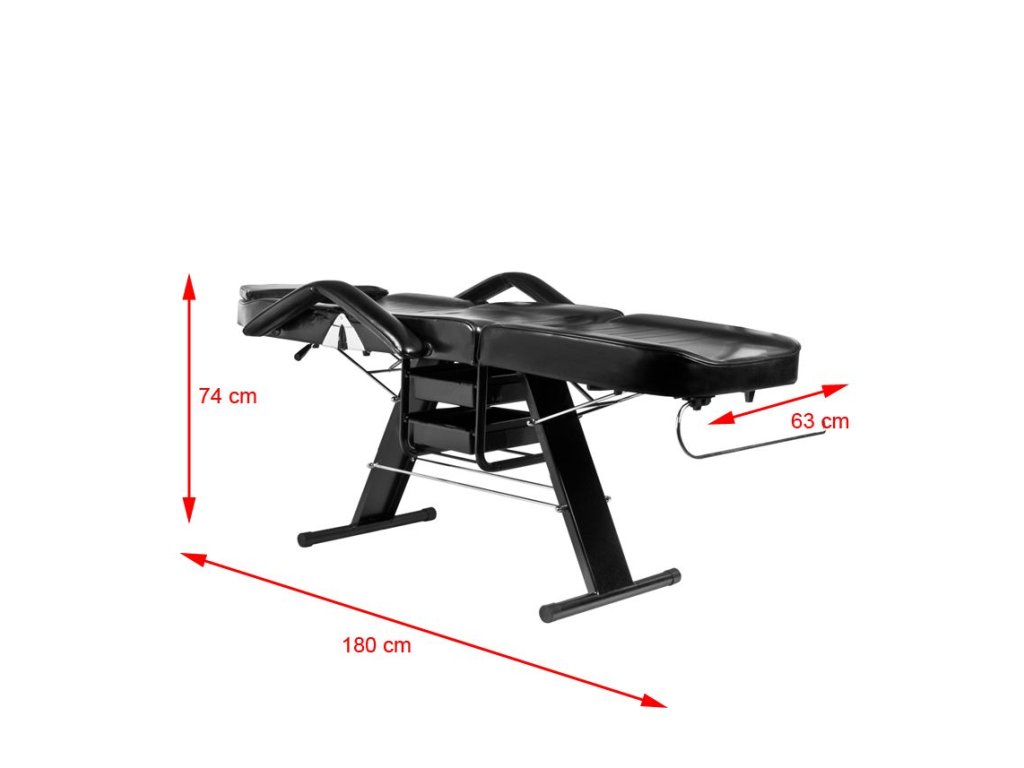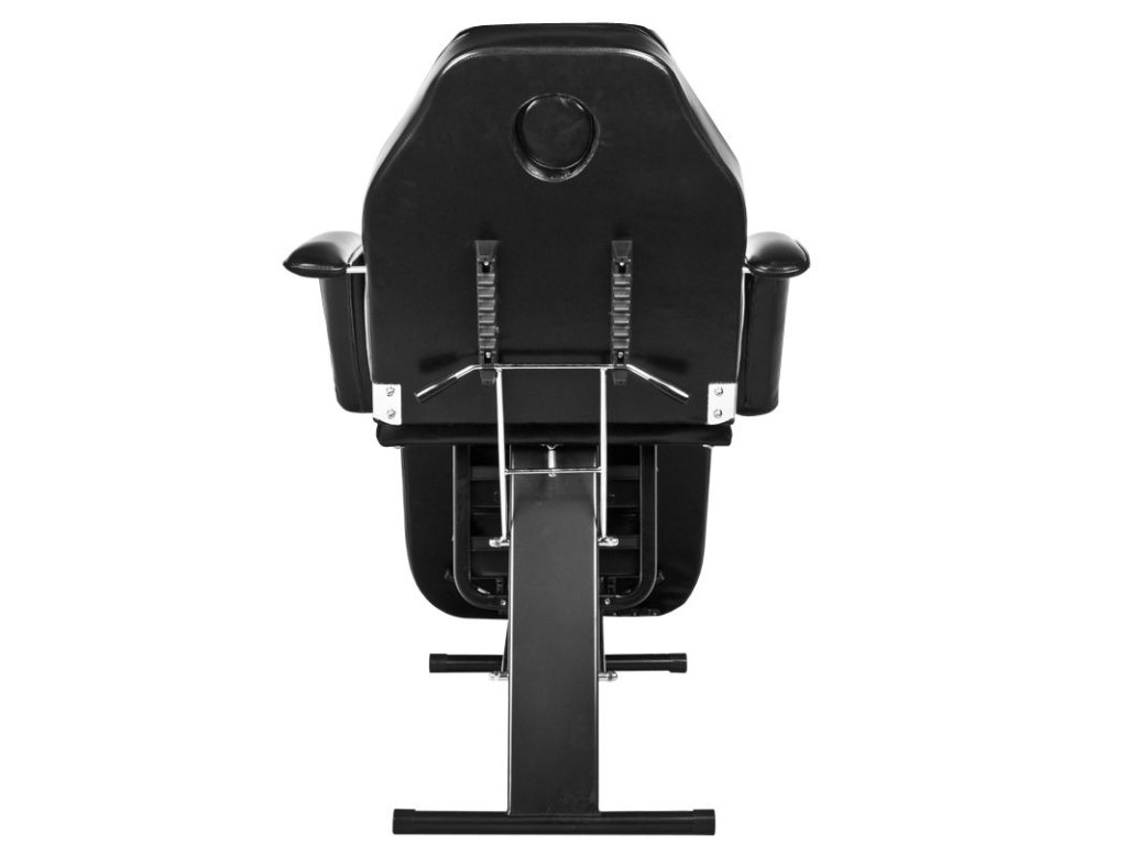 kreslo s otvorom v opierke hlavy, s praktickými odpadovými schránkami, ideálne na kozmetiku a make-up. má odnímateľné podrúčky a zástrčku v opierke hlavy. Ľahko umývateľný poťah sedadla, vyrobený z ekokože, spĺňajúci prísne požiadavky EÚ, estetické, poniklované kovové prvky. pod kreslom sa nachádza lišta na jednorazové prestieradlo, obrusy alebo uterák.