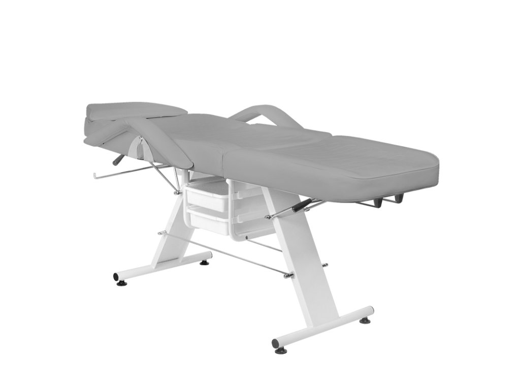 kreslo s otvorom v opierke hlavy, s praktickými odpadovými schránkami, ideálne na kozmetiku a make-up. má odnímateľné podrúčky a zástrčku v opierke hlavy. Ľahko umývateľný poťah sedadla, vyrobený z ekokože, spĺňajúci prísne požiadavky EÚ, estetické, poniklované kovové prvky. pod kreslom sa nachádza lišta na jednorazové prestieradlo, obrusy alebo uterák.