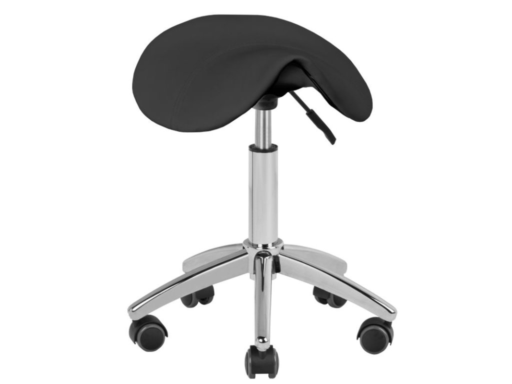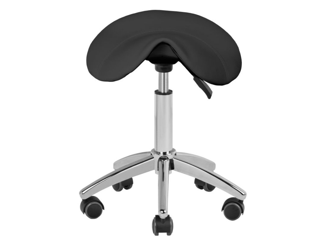 pohodlná, stabilná kozmetická stolička bez operadla, s profilovaným sedadlom, na päťhviezdičkovej základni s pogumovanými kolieskami, čierna farba, nevyhnutný kus nábytku v kozmetickom salóne.