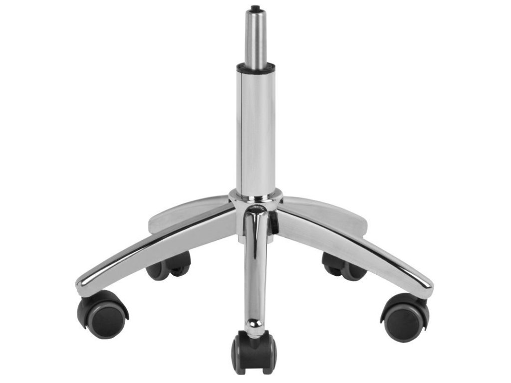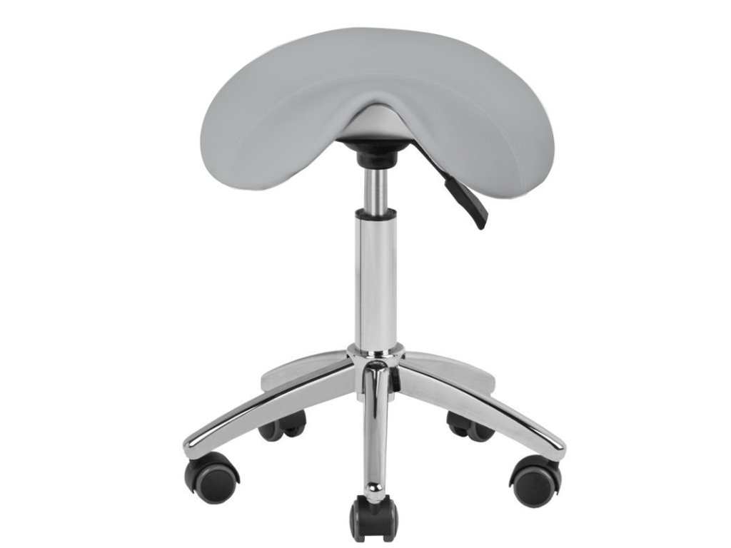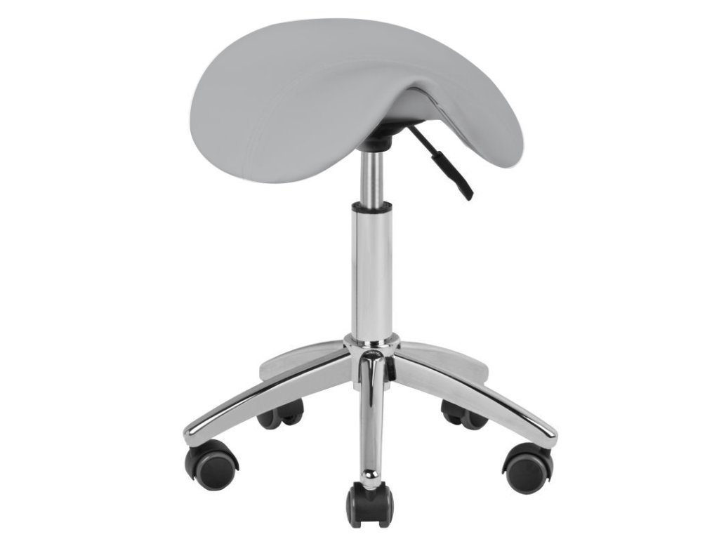 pohodlná, stabilná kozmetická stolička bez operadla, s profilovaným sedadlom, na päťhviezdičkovej základni s pogumovanými kolieskami, sivá farba, nevyhnutný kus nábytku v kozmetickom salóne.
