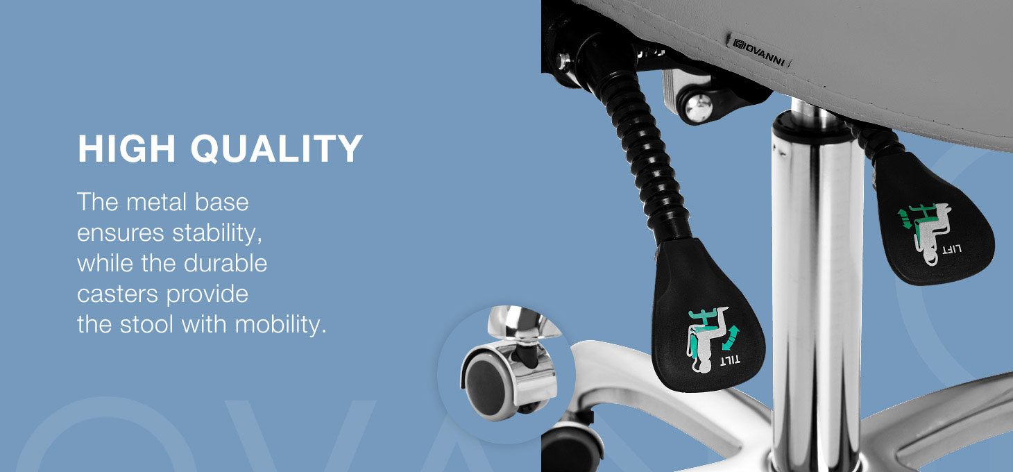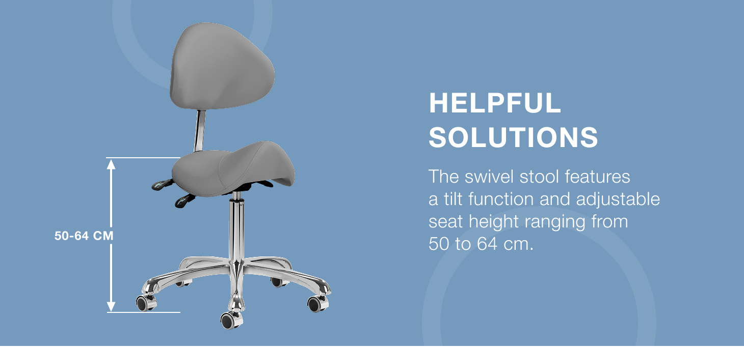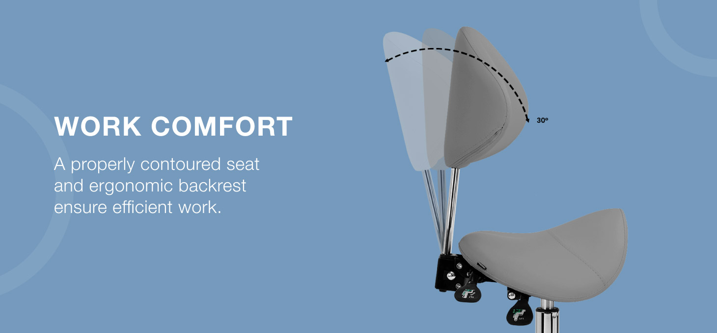 Možnosť nastavenia výšky sedadlav rozmedzí 50-64 cm umožňuje špecialistovi zaujať vhodnú polohu pri vykonávaní služieb.Tvarované operadlo, ktorý sa dá predĺžiť o 20 cm,poskytuje vynikajúcu oporu chrbtabez ohľadu na výšku používateľa.Mechanizmus úplného otáčania zefektívňuje a spríjemňuje prácu. Stolička tiežmá funkciu uzamykateľnej kolísky, ktorá umožňuje ergonomické polohovanie tela pri práci.Správne profilované sedlo v tvare sedla, vyplnené penou odolnou proti deformácii, zaručuje používateľom pohodlie a ergonómiu práce.
