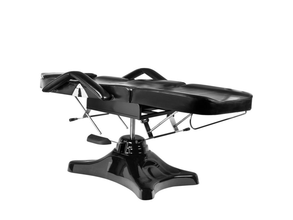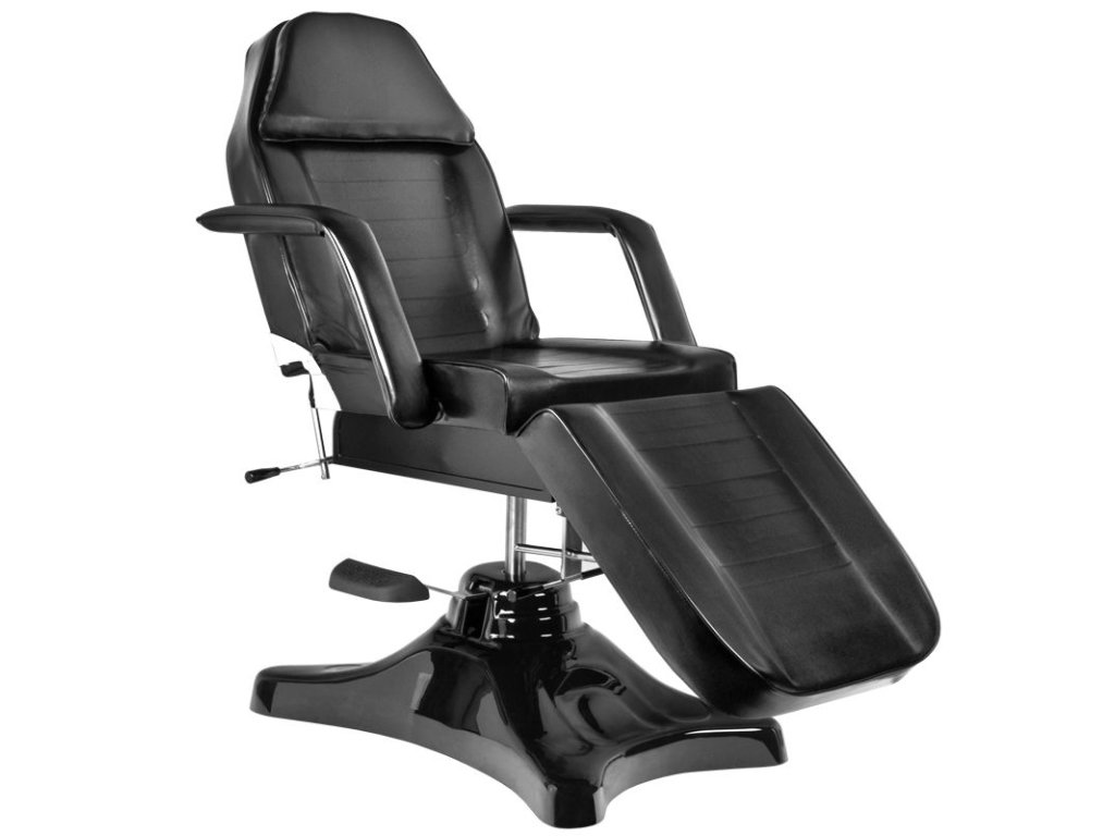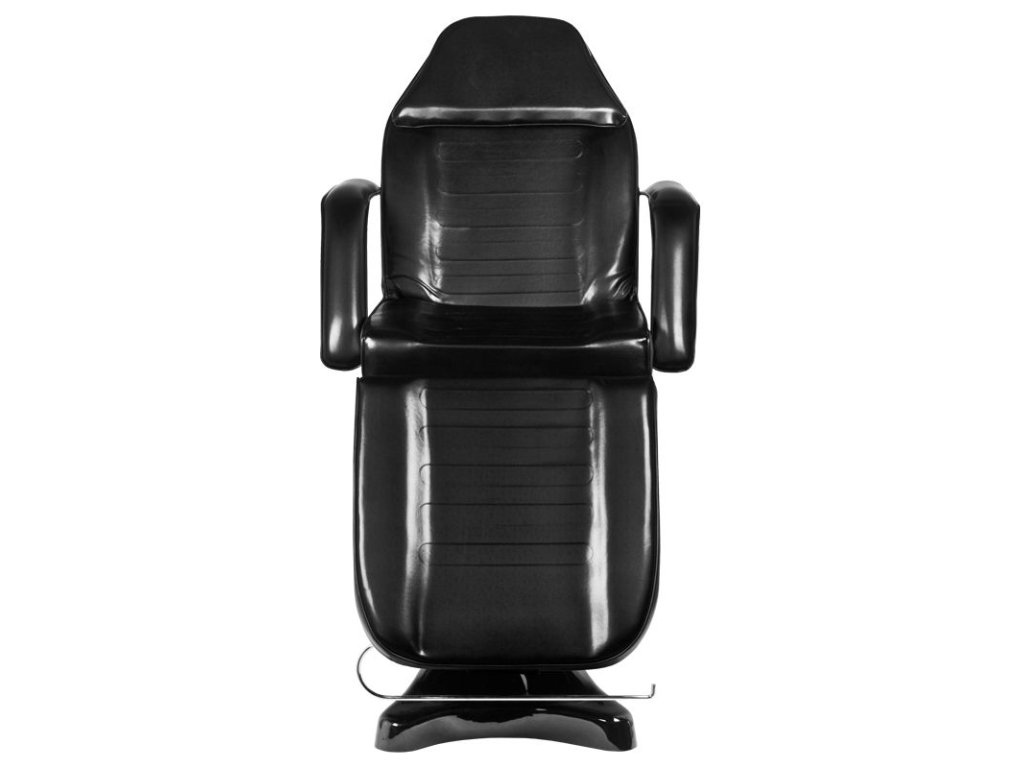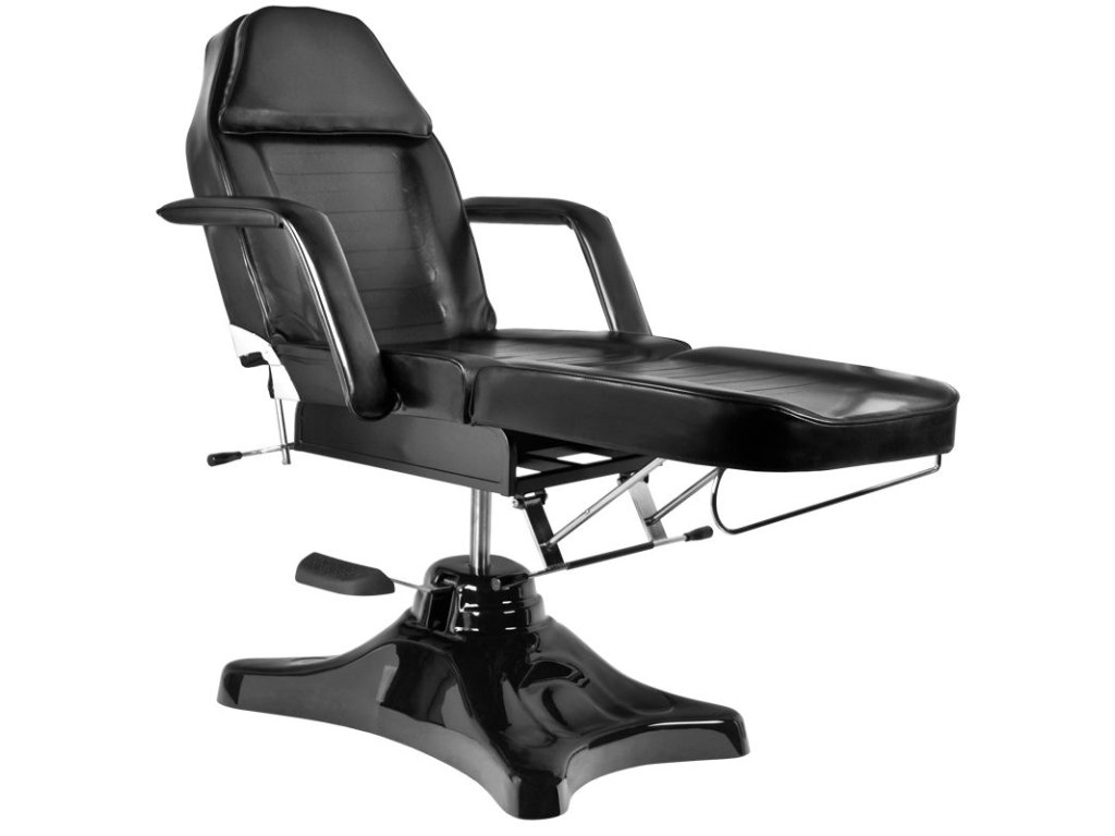 otočné kreslo so zámkom, hydraulicky zdvíhané a spúšťané, s otvorom v opierke hlavy, ideálne na kozmetiku, líčenie a masáže. má odnímateľné podrúčky a zástrčku v opierke hlavy. Ľahko umývateľný poťah sedadla, vyrobený z ekokože, spĺňajúci prísne požiadavky EÚ, estetické, poniklované kovové prvky. pod kreslom sa nachádza lišta na jednorazové prestieradlo, obrusy alebo uterák. Kreslo je k dispozícii v čiernej farbe.