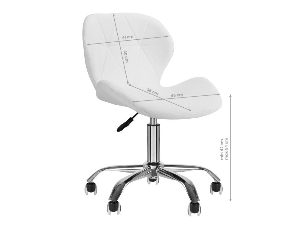 Stránkapäťhviezdičková základňa v chrómových odtieňoch je vybavenápogumované kolesá, čo zabezpečuje značnú mobilitu a umožňuje, aby sa nábytokvoľne sa pohybovať po pracovisku. Sedadlo je čalúnenéna dotyk príjemná umelá koža v elegantnom bielom odtieni. Materiálzaručuje trvanlivosť, odolnosť voči vlhkosti a jednoduché čistenie. Dizajn je doplnenýštýlové prešívanie, čím sa zvýrazní moderný vzhľad.
