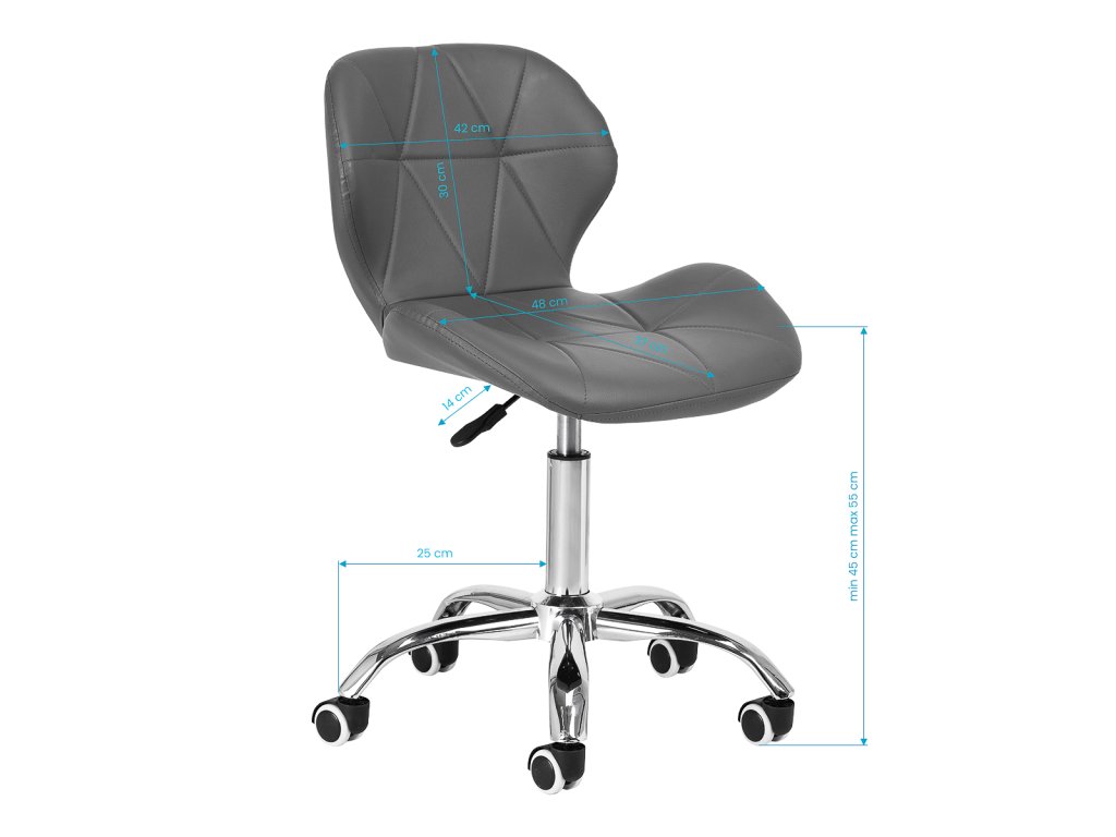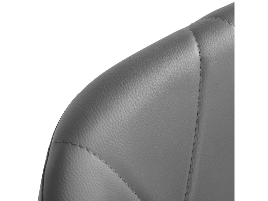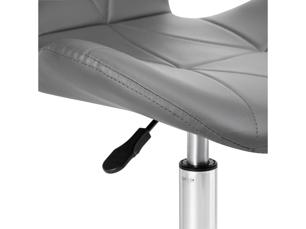 Stránkapäťhviezdičková základňa v chrómových odtieňoch je vybavenápogumované kolesá, čo zabezpečuje značnú mobilitu a umožňuje, aby sa nábytokvoľne sa pohybovať po pracovisku. Sedadlo je čalúnenéna dotyk príjemná umelá koža v elegantnom odtieni sivej. Materiálzaručuje trvanlivosť, odolnosť voči vlhkosti a jednoduché čistenie. Dizajn je doplnenýštýlové prešívanie, čím sa zvýrazní moderný vzhľad.