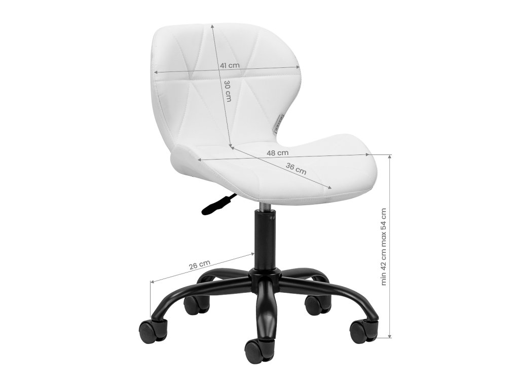 Stránkapäťhviezdičková základňa v čiernych odtieňoch je vybavenýplastové kolesá, čo zabezpečuje značnú mobilitu a umožňuje, aby sa nábytokvoľne sa pohybovať po pracovisku. Sedadlo je čalúnenéna dotyk príjemná umelá koža v elegantnom bielom odtieni. Materiálzaručuje trvanlivosť, odolnosť voči vlhkosti a jednoduché čistenie. Dizajn je doplnenýštýlové prešívanie, čím sa zvýrazní moderný vzhľad.