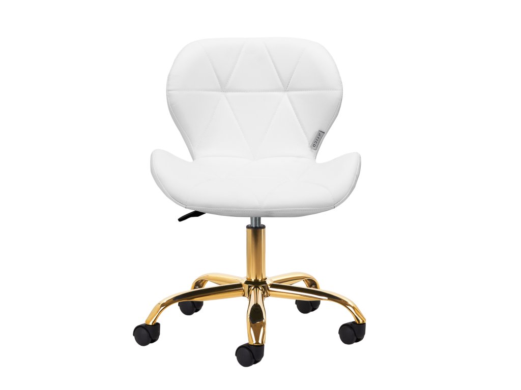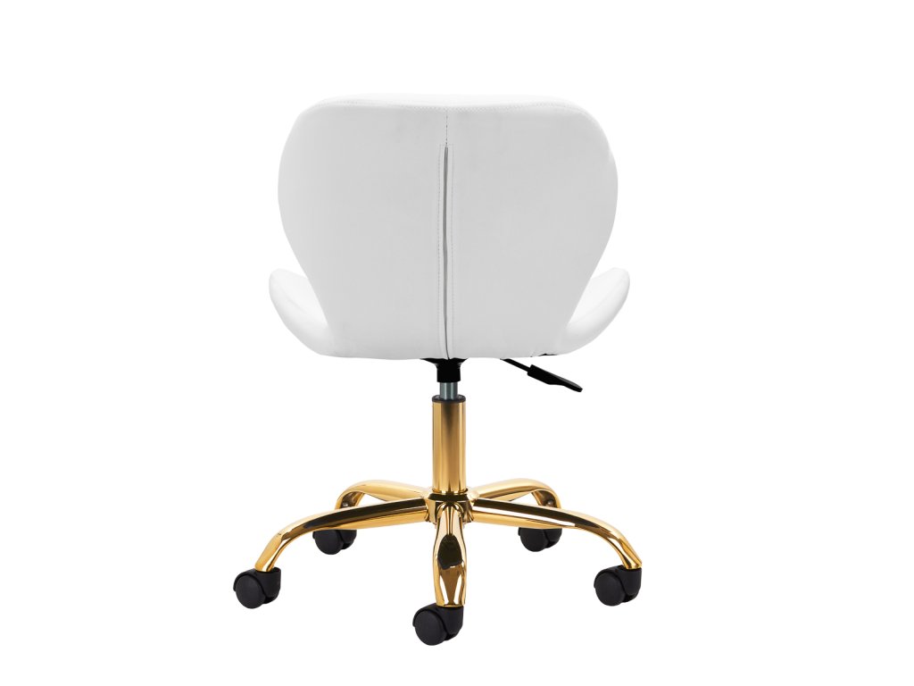 Stránkapäťhviezdičková základňa v zlatých odtieňoch je vybavenáplastové kolesá, čo zabezpečuje značnú mobilitu a umožňuje, aby sa nábytokvoľne sa pohybovať po pracovisku. Sedadlo je čalúnenéna dotyk príjemná umelá koža v elegantnom bielom odtieni. Materiálzaručuje trvanlivosť, odolnosť voči vlhkosti a jednoduché čistenie. Dizajn je doplnenýštýlové prešívanie, čím sa zvýrazní moderný vzhľad.