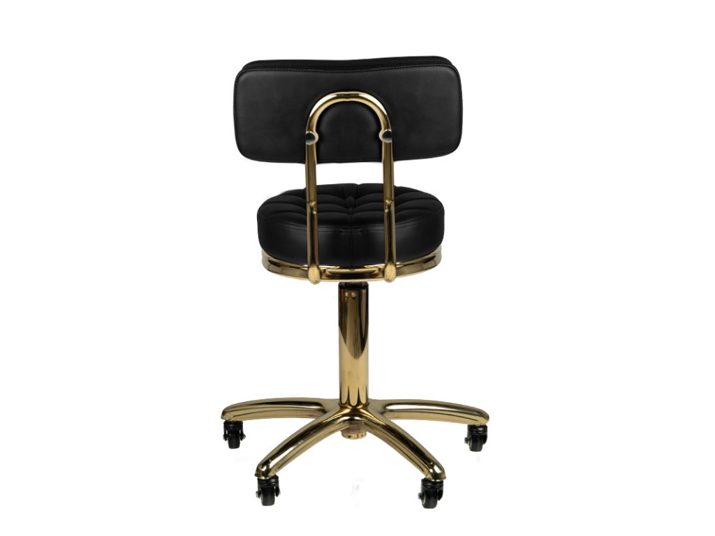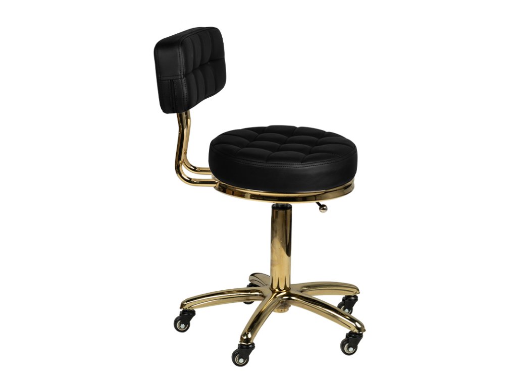 Jedinečná čierna kozmetická stolička s prešívaným sedadlom a pohodlným operadlom. kovové prvky žiaria zlatou farbou. je výškovo nastaviteľná a podstava v tvare ramena je vybavená pevnými kovovo-gumovými kolieskami.