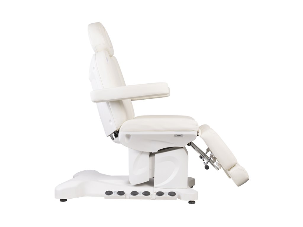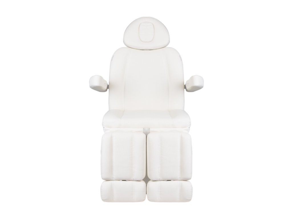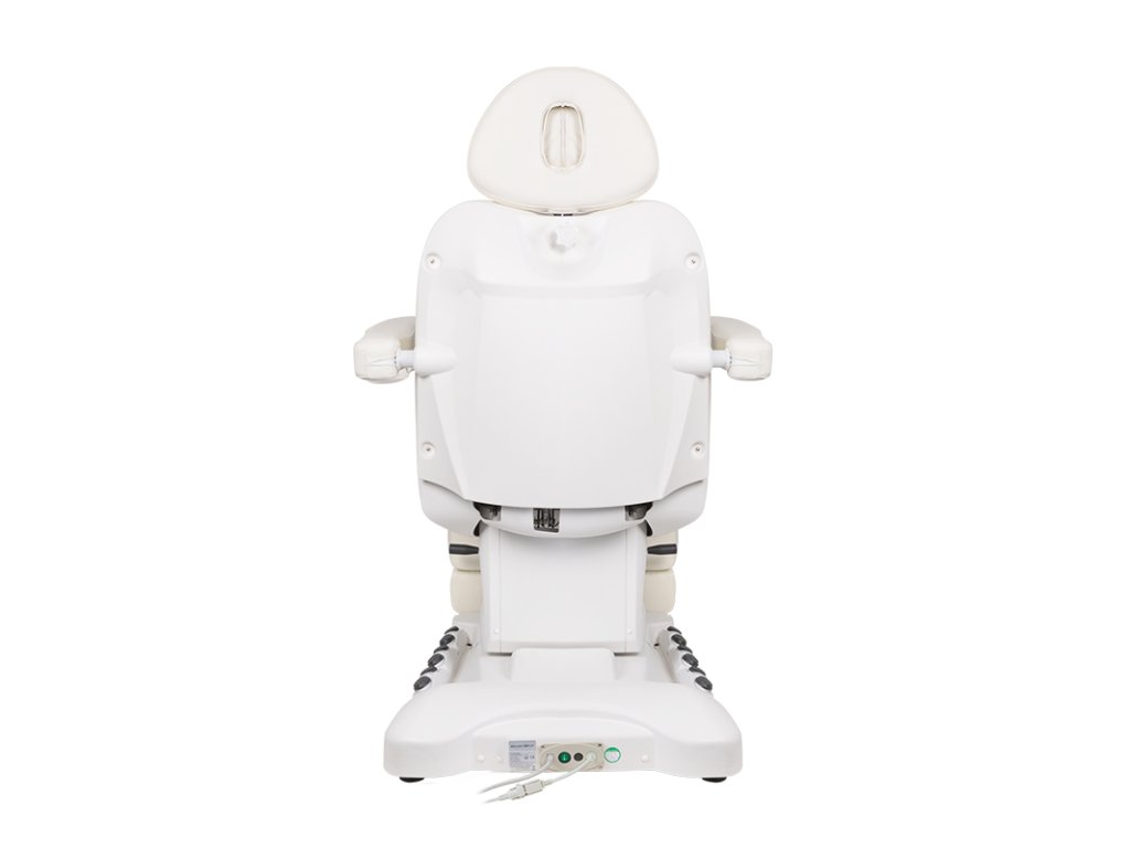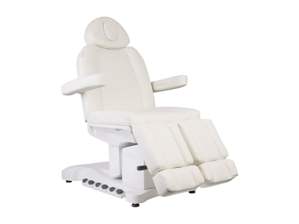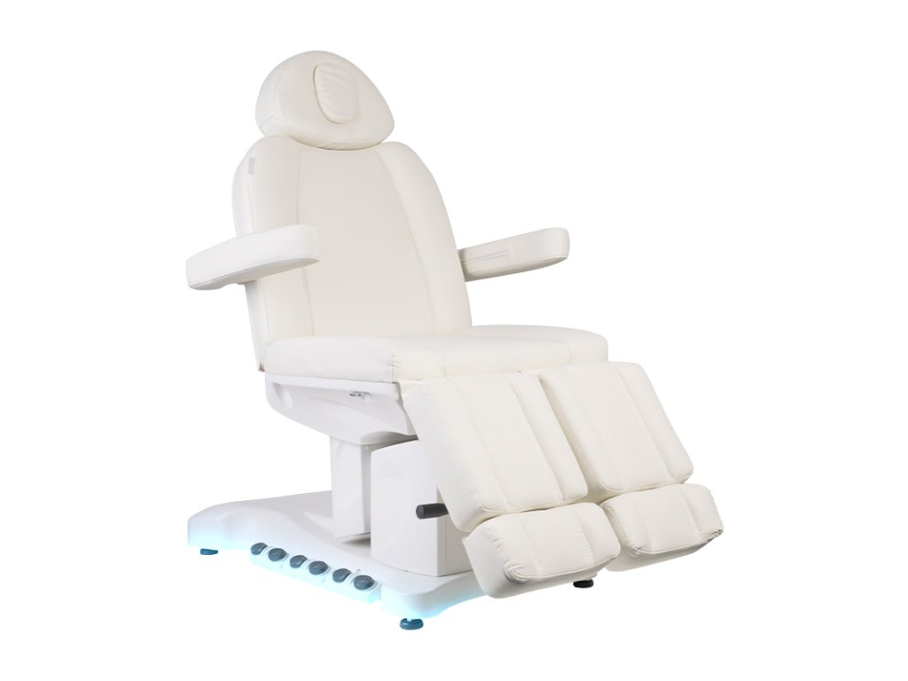 Jedinečné elektrické kozmetické kreslo, ideálne pre kozmetické salóny a SPA salóny. Vďaka nezávislým pohonom umožňuje nastavenie stoličky v 3 rovinách pomocou diaľkového ovládania a nožných spínačov, ktorá poskytuje možnosť pohodlnej pedikúry, ako aj ošetrenia tváre a tela. Pomocou diaľkového ovládania môžeme využiť naprogramované nastavenia a spustiť funkciu HOT, t. j. vyhrievanie. Kreslo využíva perforované čalúnenie, ktoré je v iných kreslách nevídané, a farebné LED osvetlenie základne.
