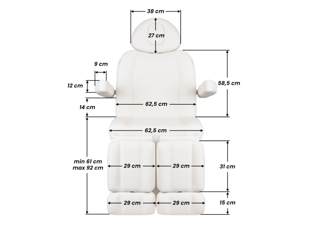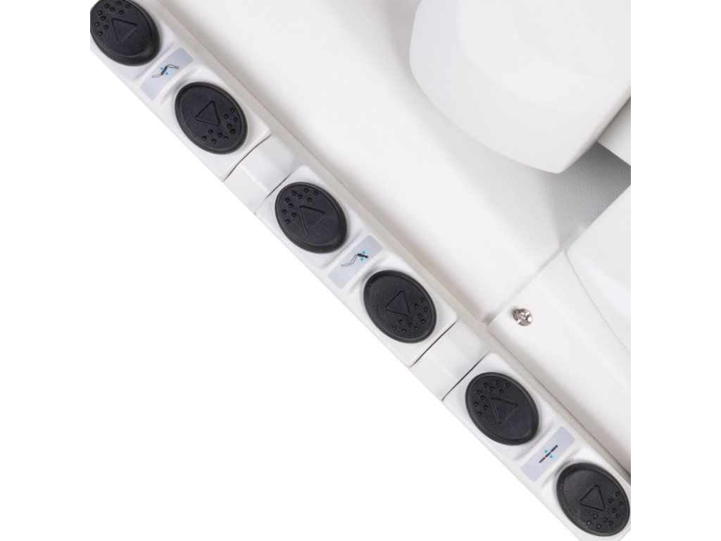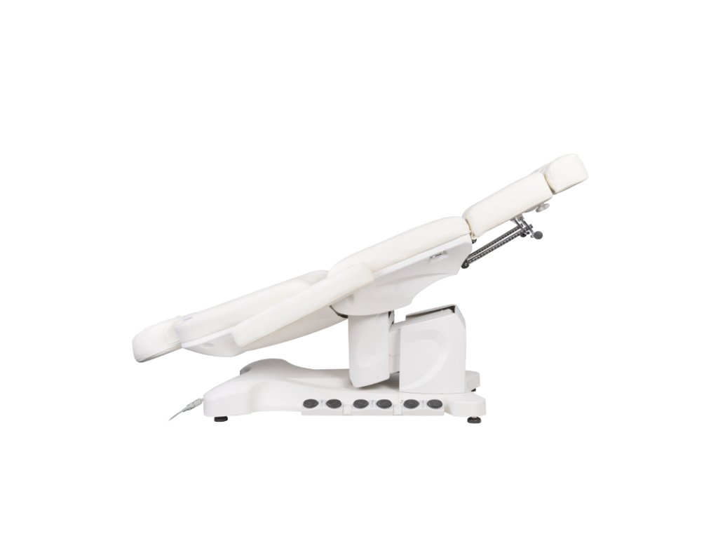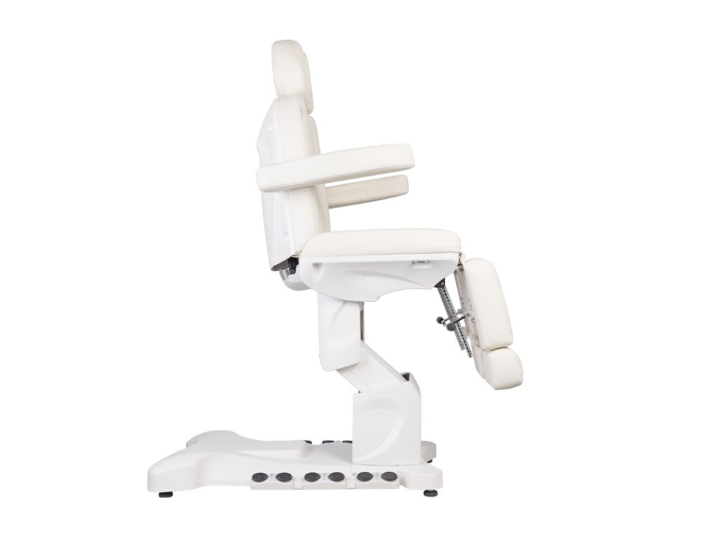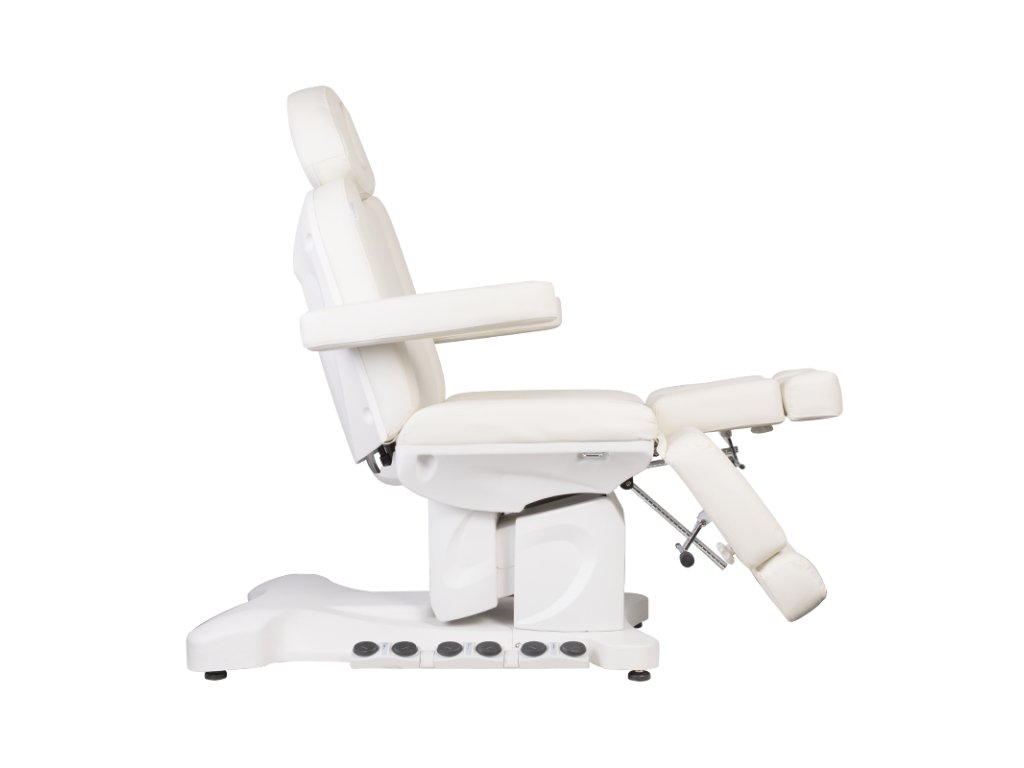 Jedinečné elektrické kozmetické kreslo, ideálne pre kozmetické salóny a SPA salóny. Vďaka nezávislým pohonom umožňuje nastavenie stoličky v 3 rovinách pomocou diaľkového ovládania a nožných spínačov, ktorá poskytuje možnosť pohodlnej pedikúry, ako aj ošetrenia tváre a tela. Pomocou diaľkového ovládania môžeme využiť naprogramované nastavenia a spustiť funkciu HOT, t. j. vyhrievanie. Kreslo využíva perforované čalúnenie, ktoré je v iných kreslách nevídané, a farebné LED osvetlenie základne.