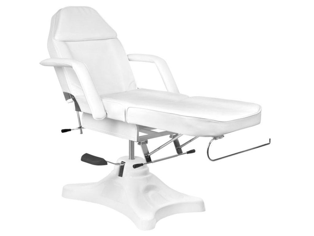 s otvorom v opierke hlavy, ideálnym na kozmetiku, líčenie a masáže. má odnímateľné podrúčky a zástrčku v opierke hlavy. Ľahko umývateľný poťah sedadla, vyrobený z ekokože, spĺňajúci prísne požiadavky EÚ, estetické, poniklované kovové prvky. pod kreslom je lišta na jednorazové prestieradlo, obrusy alebo uterák. Kreslo je k dispozícii v bielej farbe.