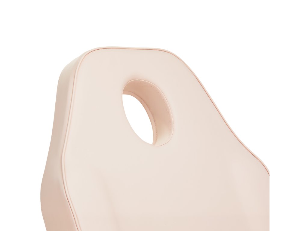 Stabilné, mäkké opierky rúk zaručujú používateľoviprimeraná podpora. Tieto prvky, rozdelené na polovicu, sú pohyblivé, takže dobre sedí pri zmene polohy operadlaa možno ich tiež ľahko odstrániť.Skrytý pod vhodne profilovaným vankúšom, otvor v opierke hlavy vyrába stoličkuideálny na ošetrenie tváre aj chrbta.