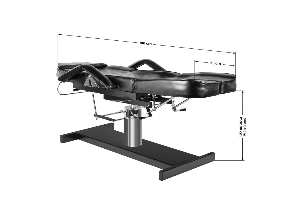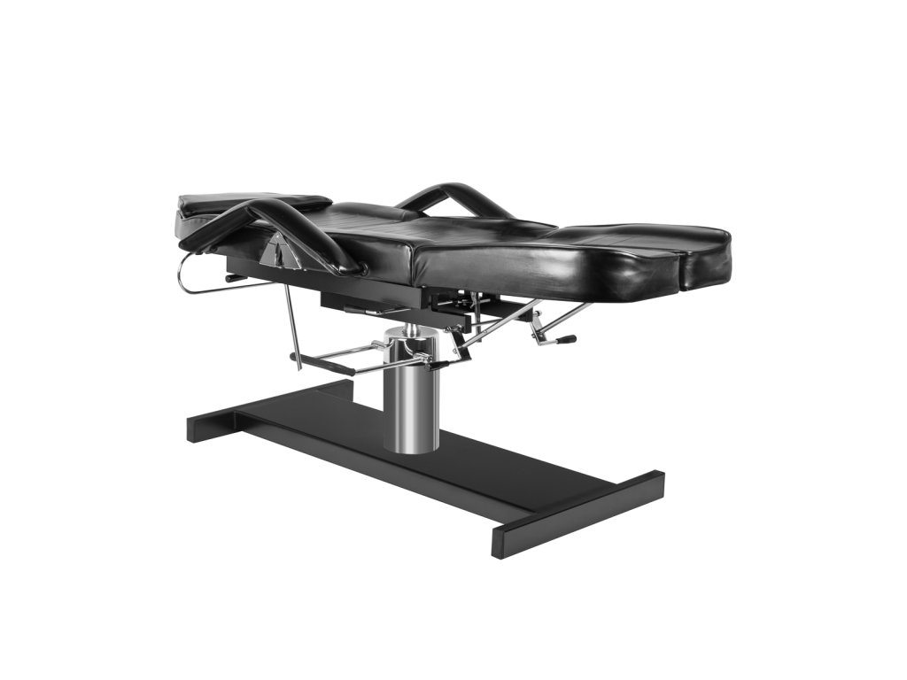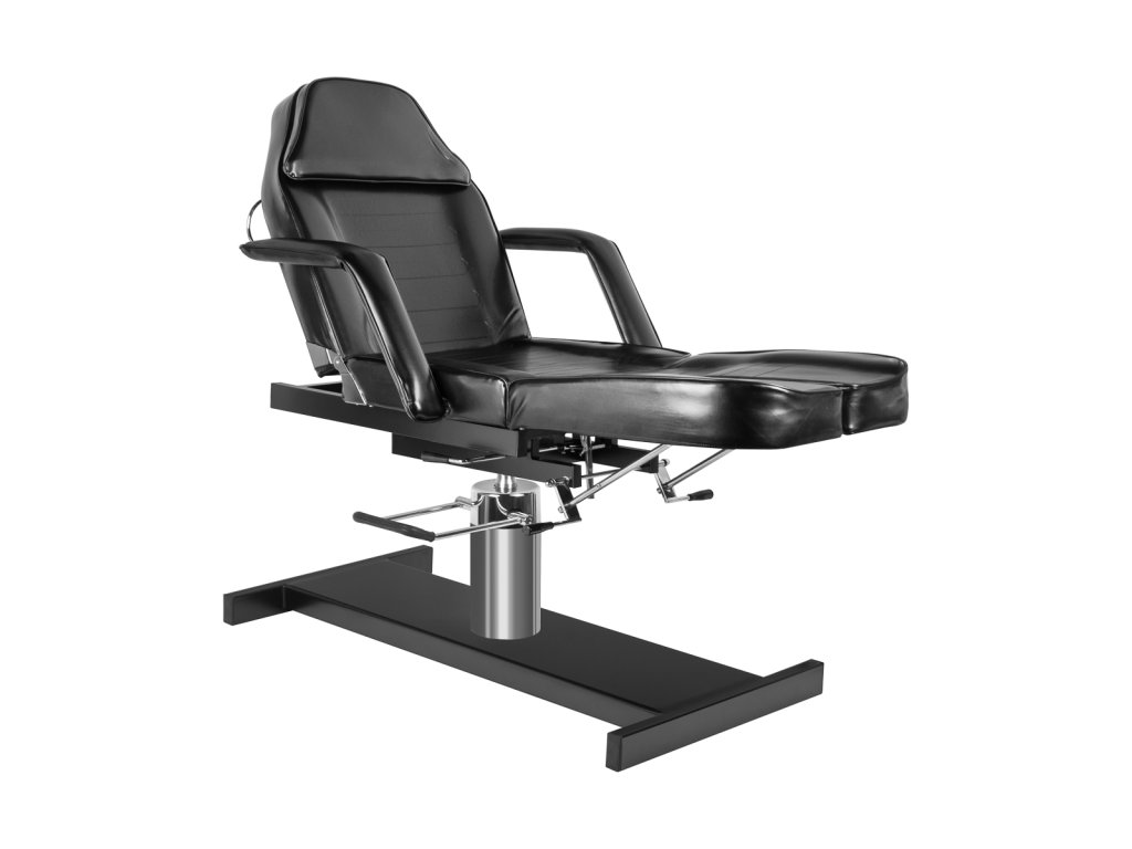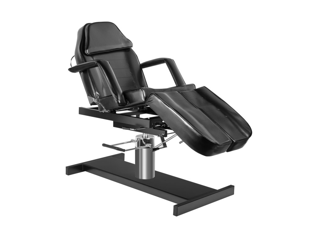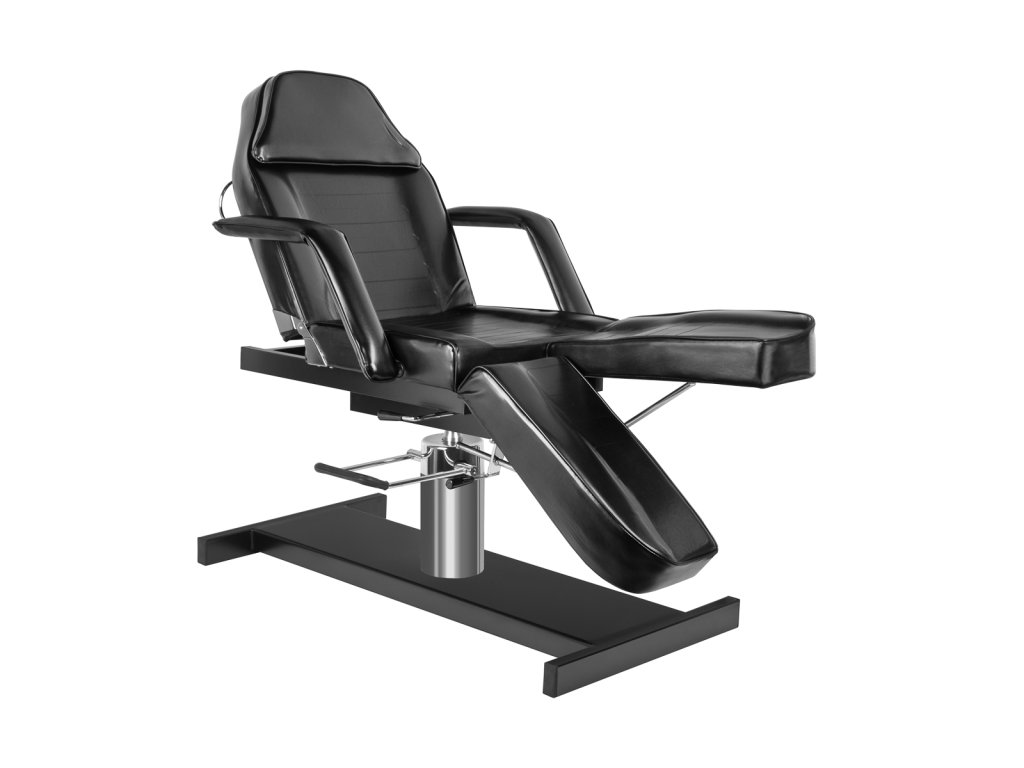 otočné kreslo s blokádou, s delenými podnožkami, hydraulicky zdvíhané a spúšťané, s otvorom v opierke hlavy, ideálne na kozmetiku, ošetrenie pedikúry, líčenie a masáže. má odnímateľné podrúčky a zástrčku v opierke hlavy. Ľahko umývateľný poťah sedadla, vyrobený z ekokože, spĺňajúci prísne požiadavky EÚ, estetické, poniklované kovové prvky. kreslo je dostupné v čiernej farbe.