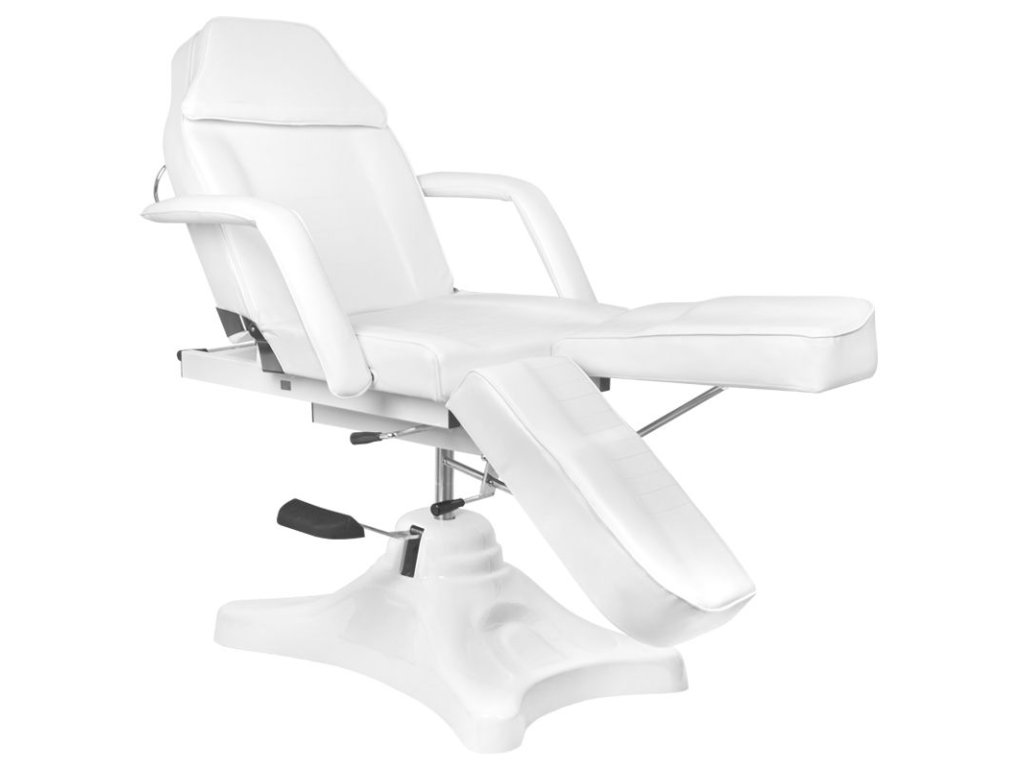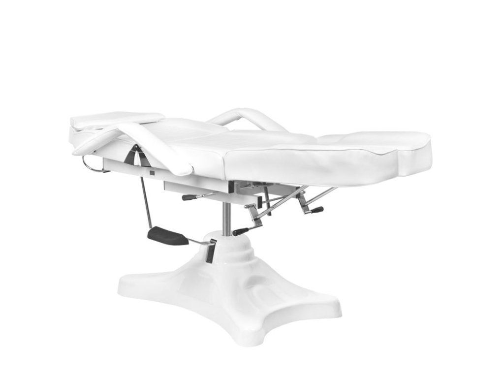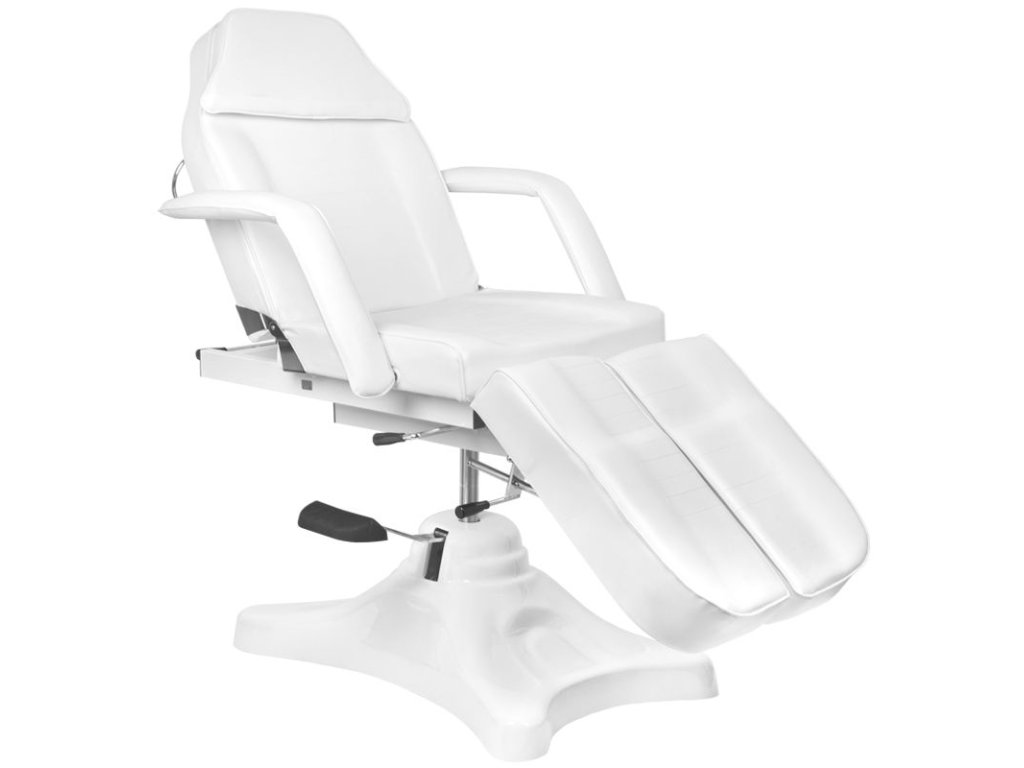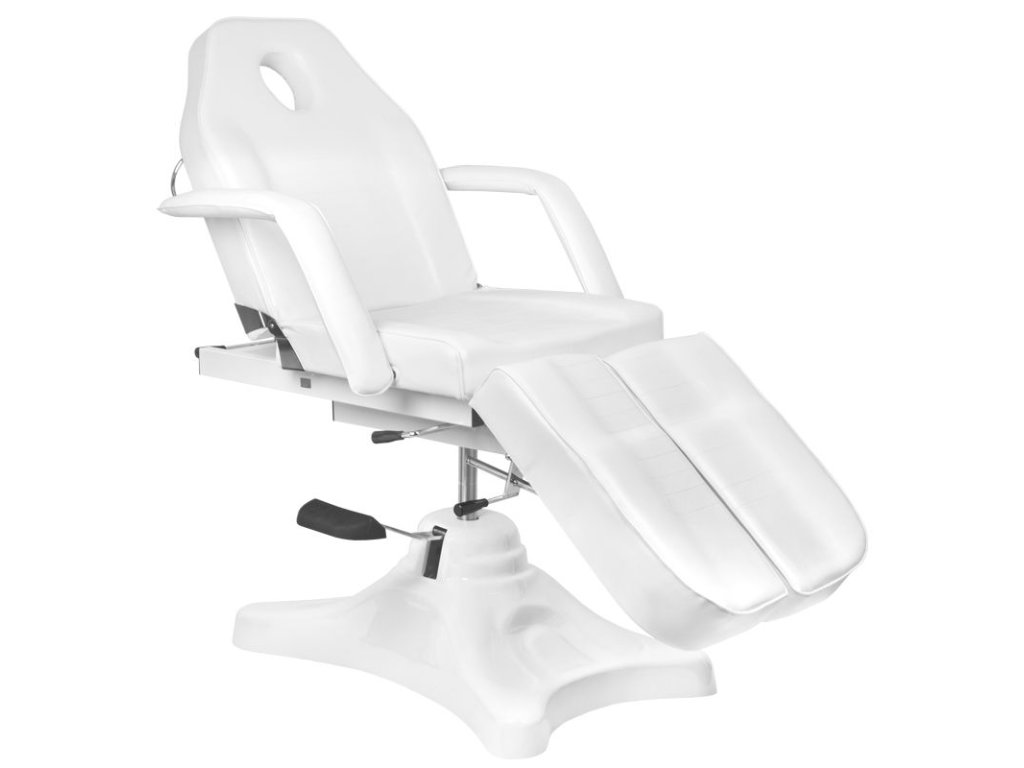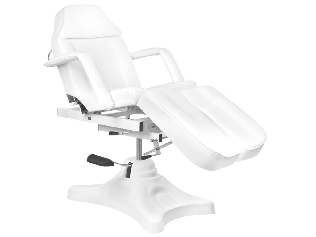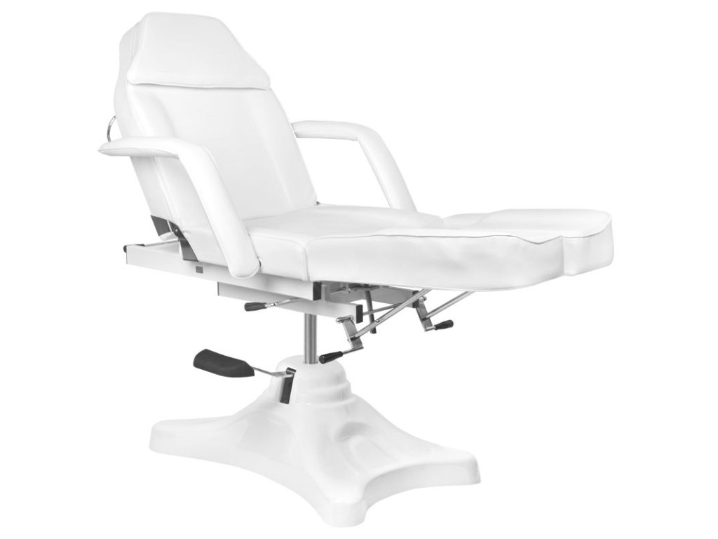 otočné kreslo s blokádou, s delenými podnožkami, hydraulicky zdvíhané a spúšťané, s otvorom v opierke hlavy, ideálne na kozmetiku, pedikúru, líčenie a masáže. má odnímateľné podrúčky a zástrčku v opierke hlavy. Ľahko umývateľný poťah sedadla, vyrobený z ekokože, spĺňajúci prísne požiadavky EÚ, estetické, poniklované kovové prvky. kreslo je dostupné v bielej farbe.