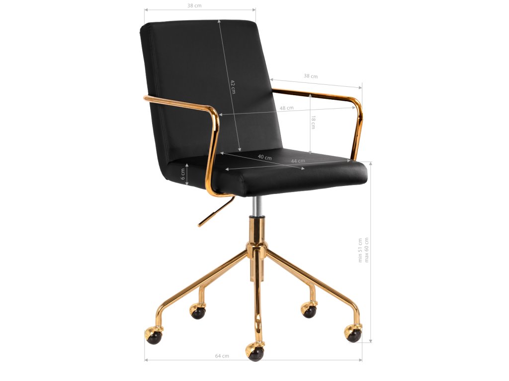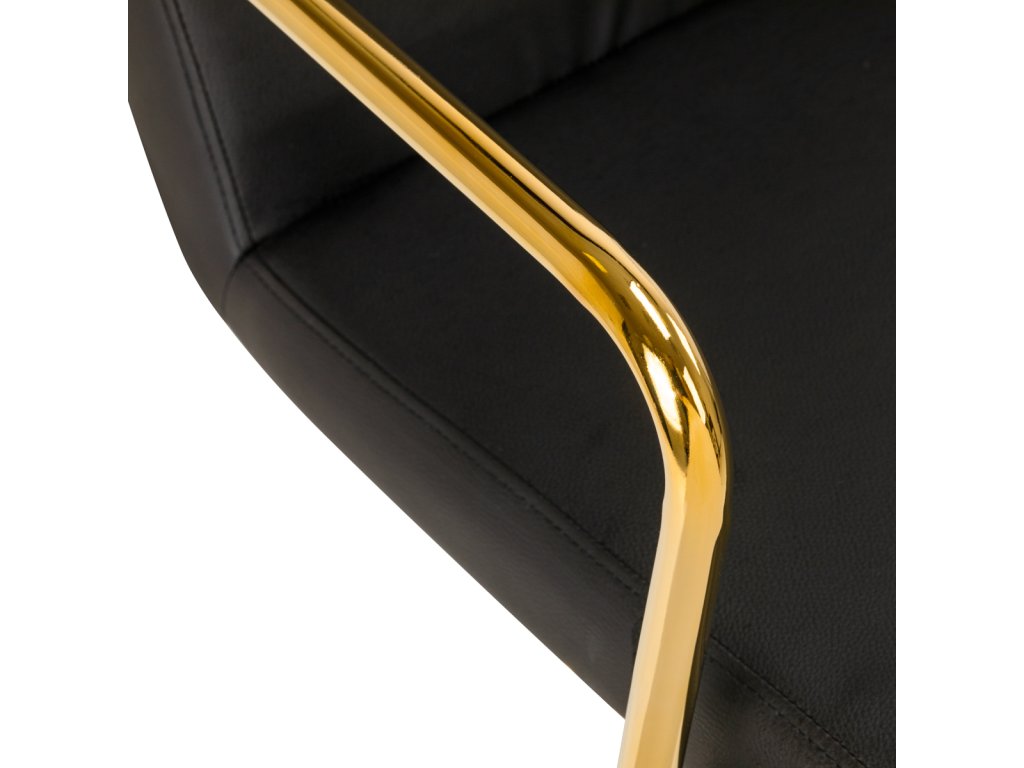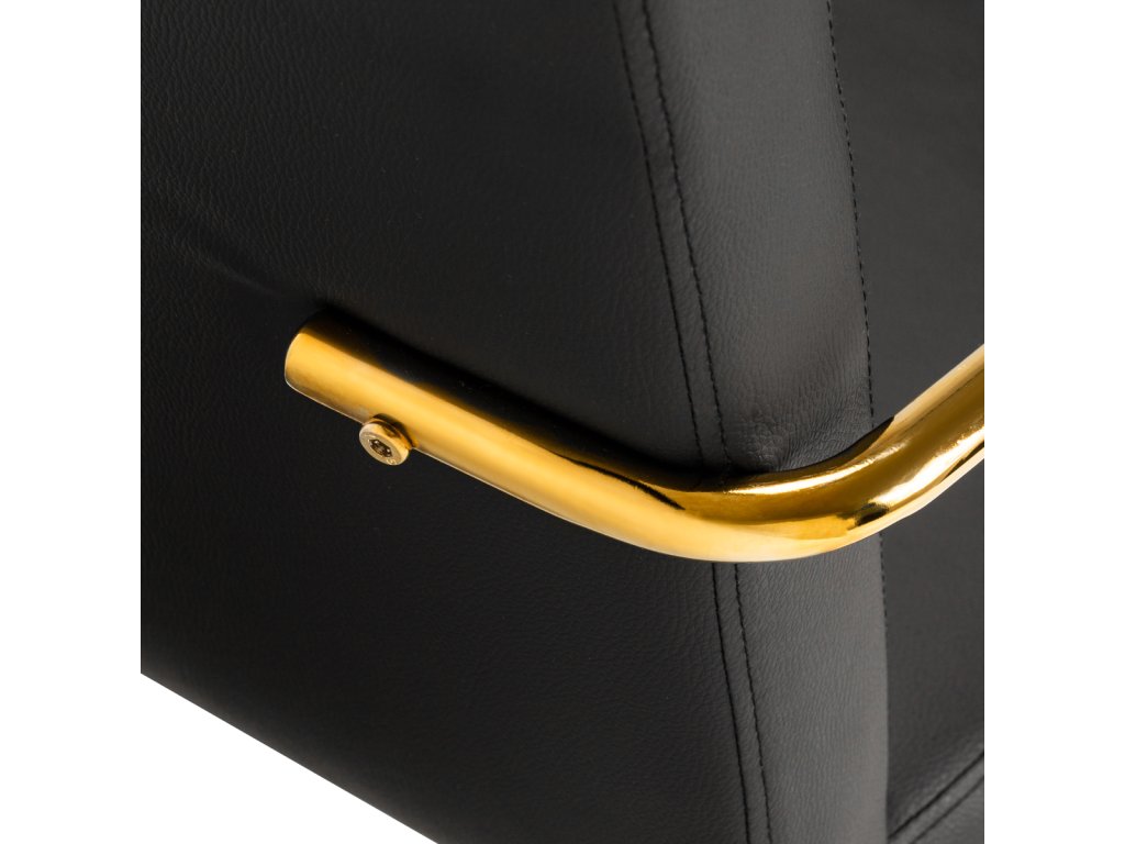 Príjemný na dotyk, čalúnenie zo syntetickej kože v odtieňoch čiernej farby dodáva nábytku jedinečný charakter.Elegantná povrchová úprava je skutočným lákadlom pre oči. Rám v odtieňoch zlatej dodáva eleganciu a dokonale ladí s jednoduchými tvarmi.Funkčné kolieskaposkytujú značnú mobilitu, čo uľahčuje premiestňovanie kresla a pohyb po salóne počas práce.Estetika spracovania, komfort používania a ergonomicky profilované operadlo aby stolička spĺňala požiadavky aj tých najnáročnejších používateľov.