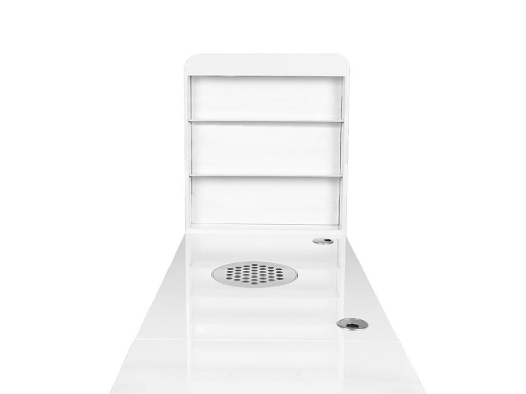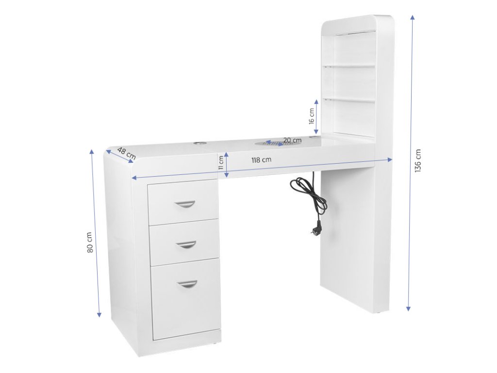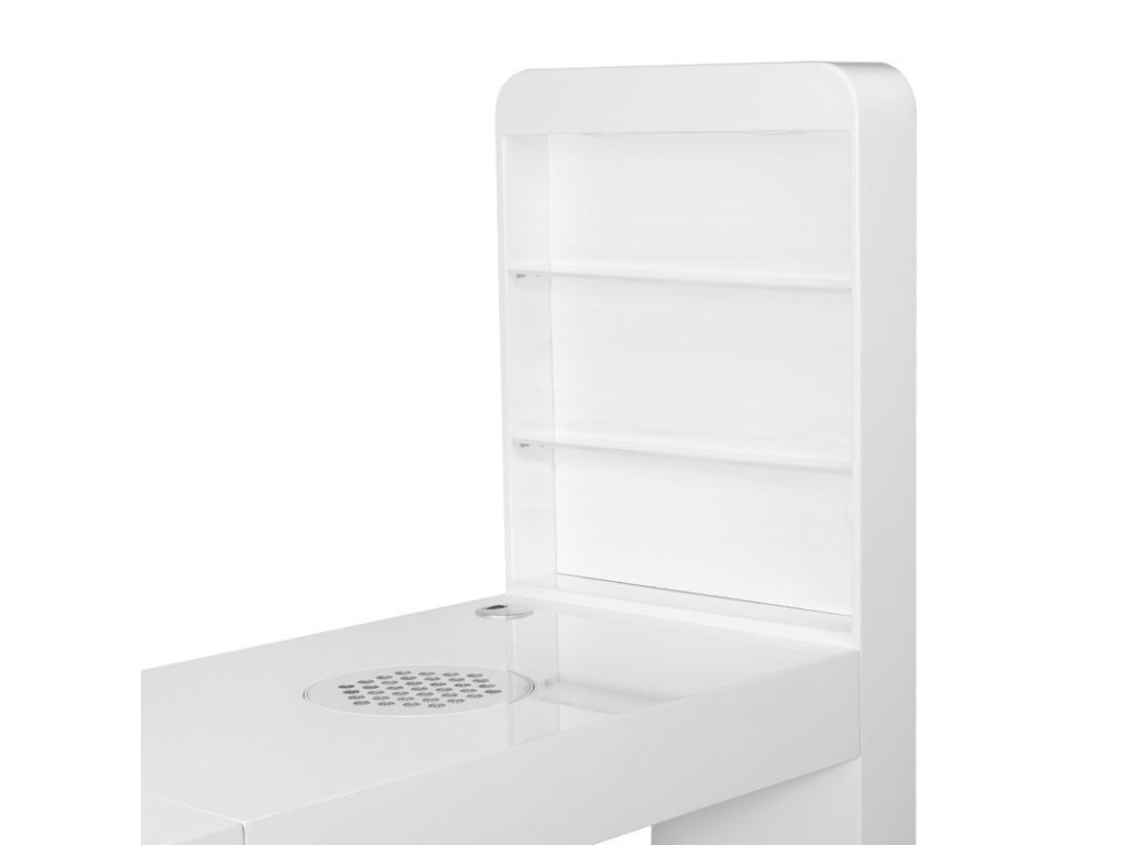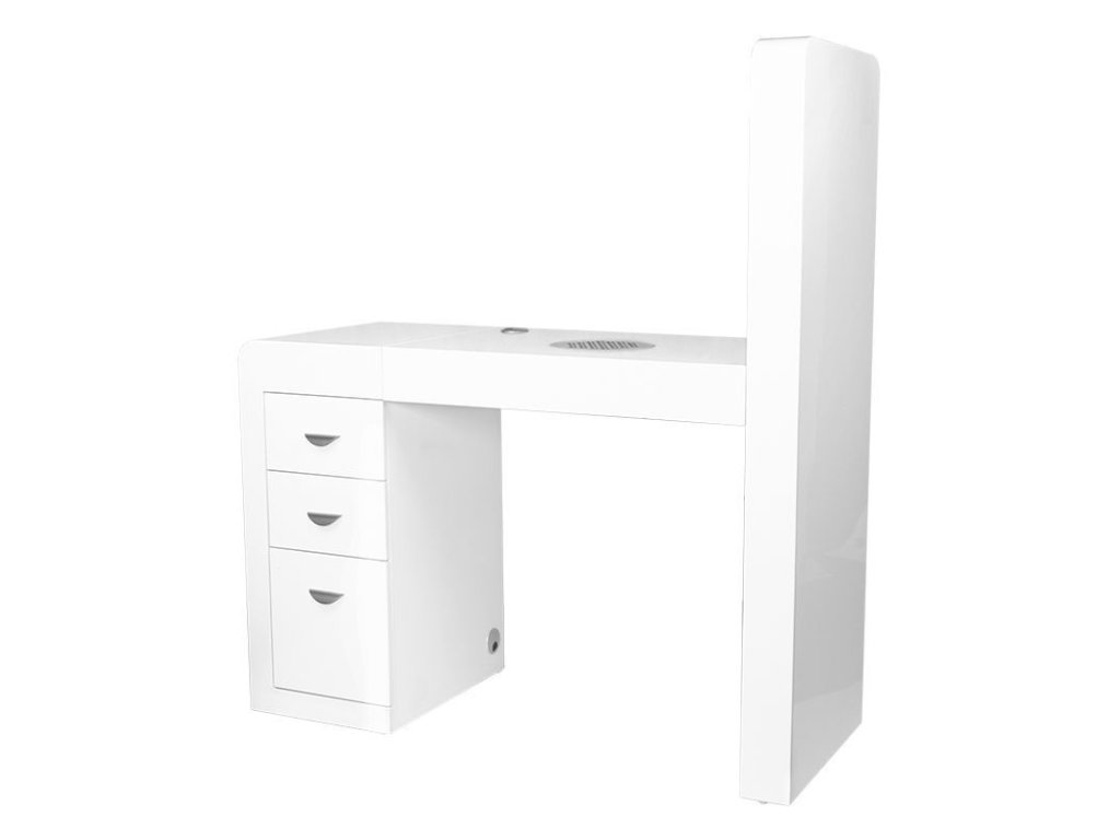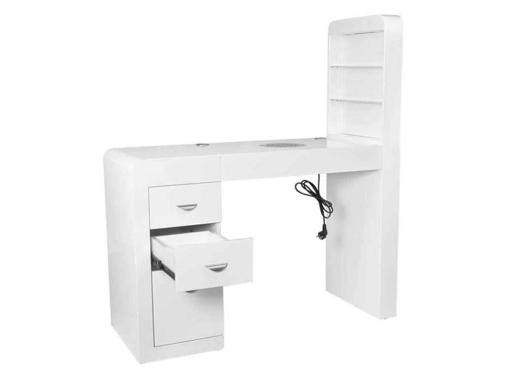 kozmetický stôl s pohlcovačom - veľmi funkčný kus nábytku pre kozmetické salóny, ktorý v sebe spája tri funkcie: stôl, pohlcovač prachu a stojan na vystavenie lakov atď. kus nábytku, ktorý dokonale zapadá do zariadenia moderných miestností. má skrinku s priestrannými zásuvkami. kus nábytku bol špeciálne navrhnutý tak, aby čo najviac uľahčil prácu a obmedzil problém s vyčnievajúcimi káblami (od svietidiel, fréz, pohlcovačov atď.):