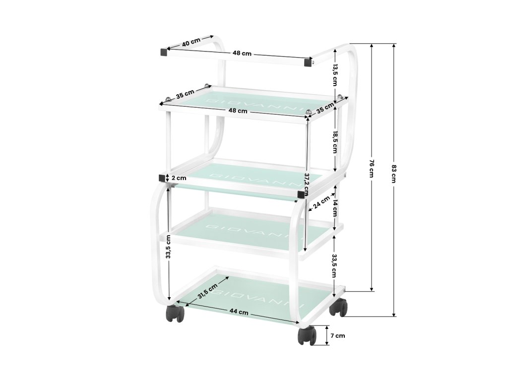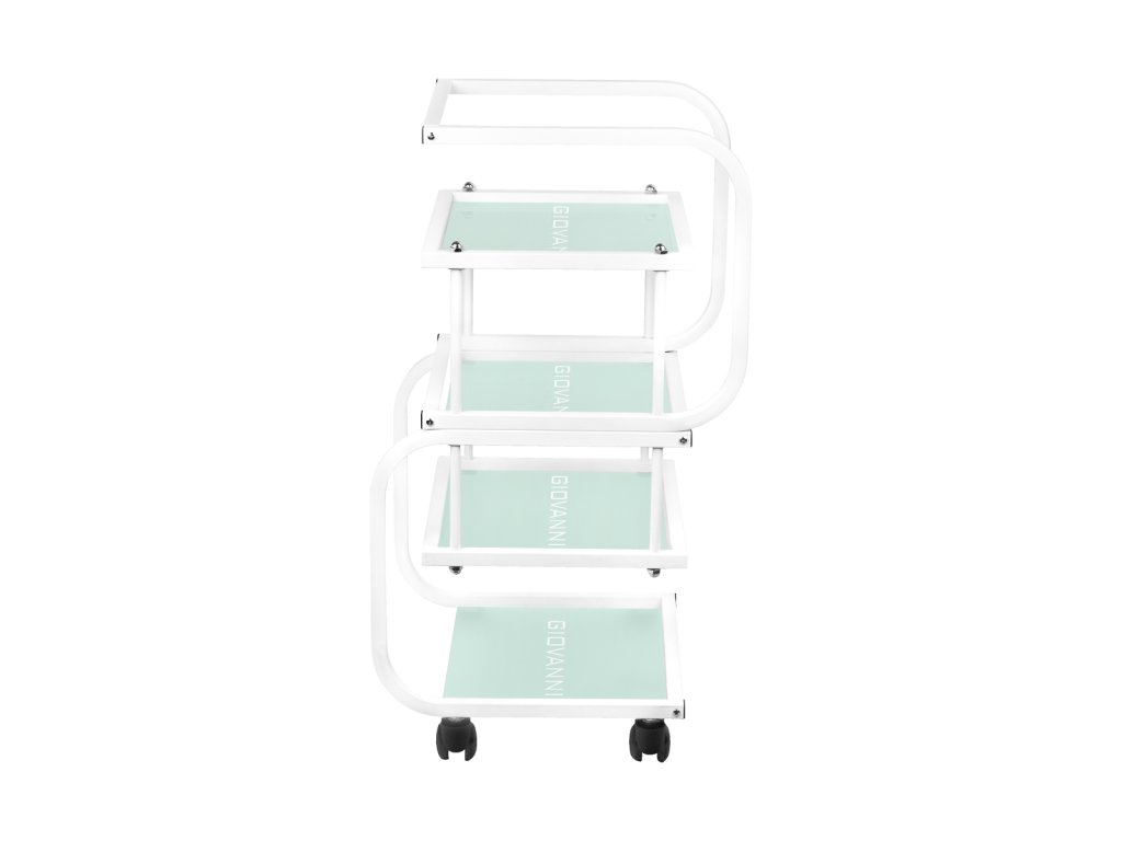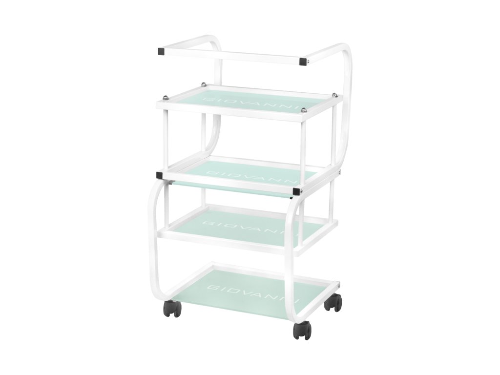 estetický stolík na kozmetické pomôcky, vyrobený z kovu a skla, s kolieskami. má štyri sklenené police.