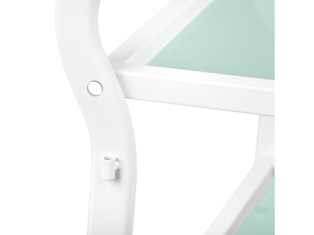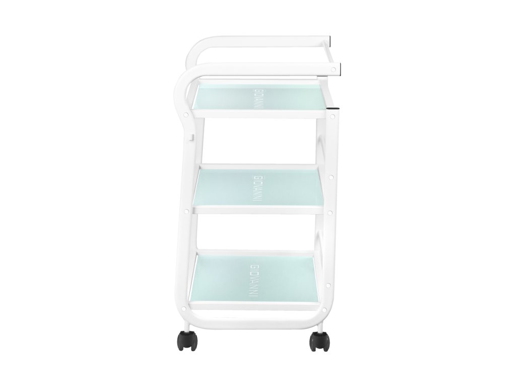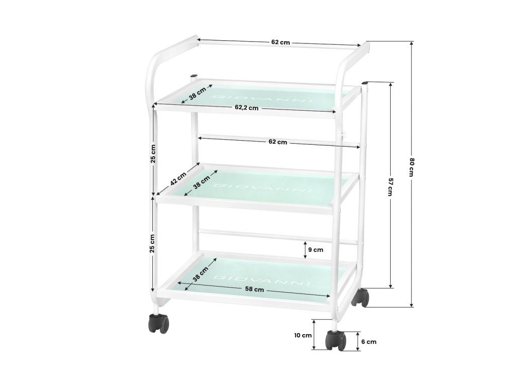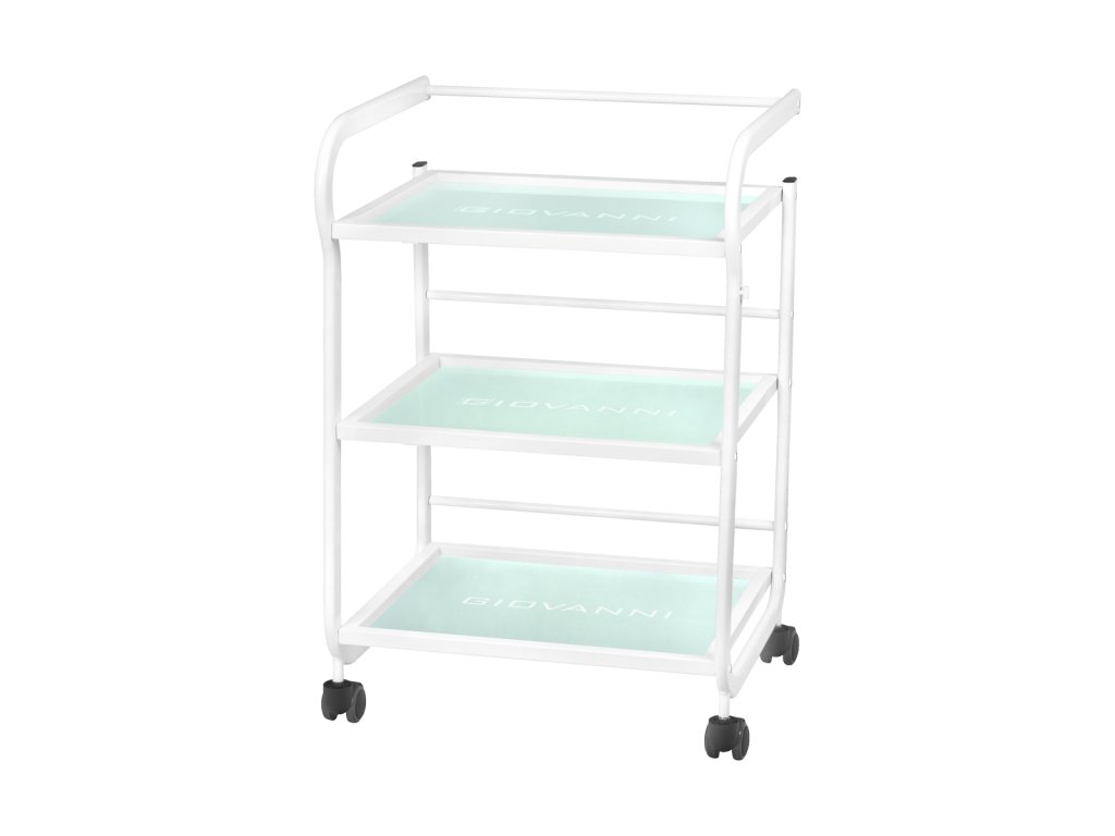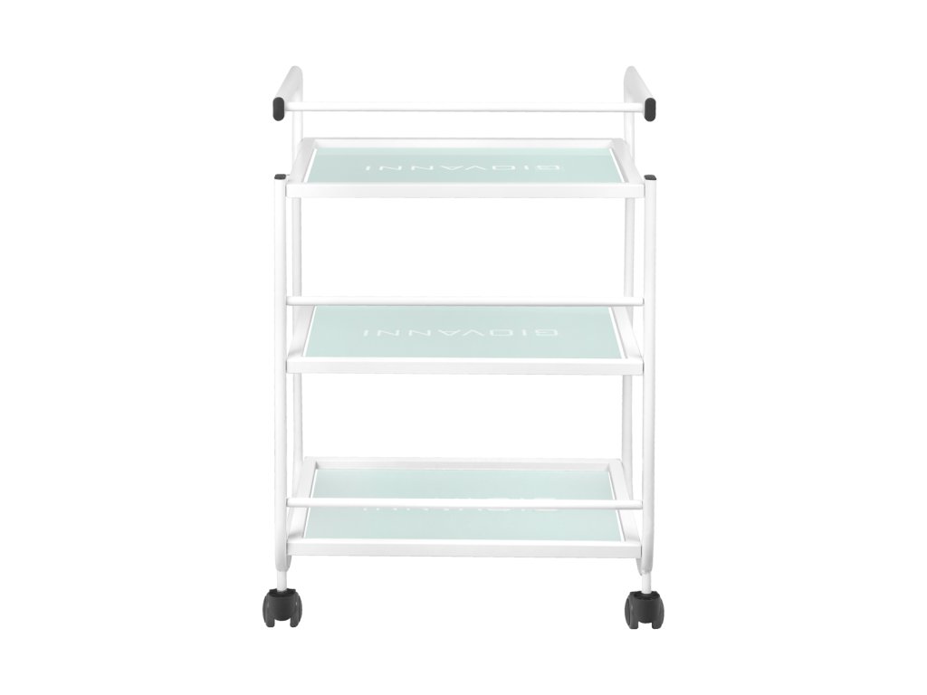 stolík na kozmetický prístroj, vyrobený z kovu a skla, s kolieskami. má tri sklenené police.
