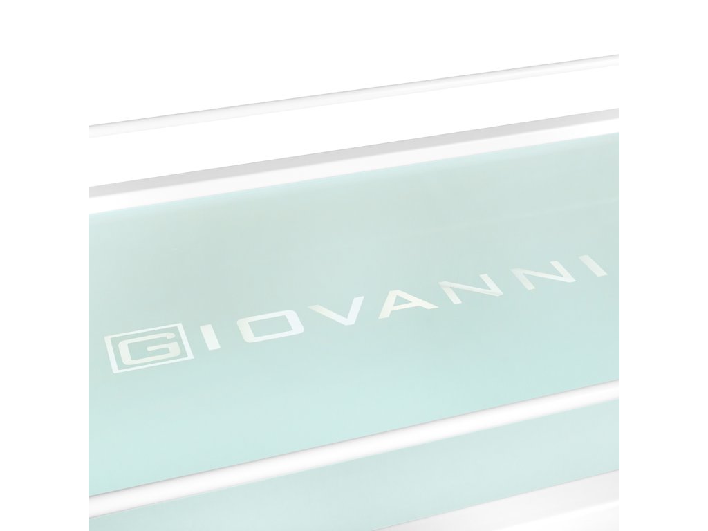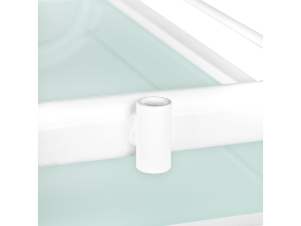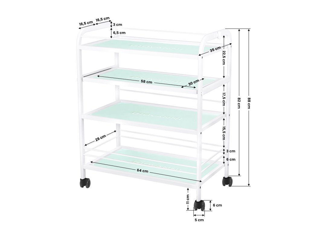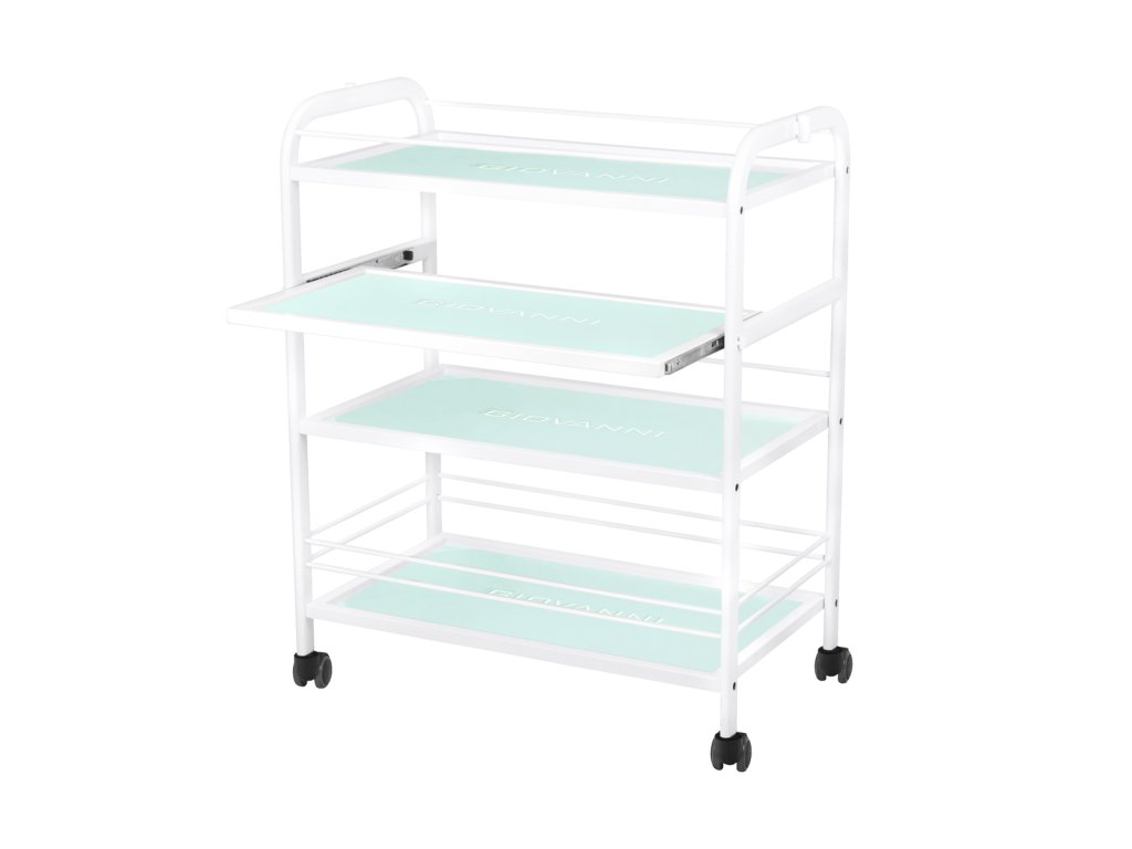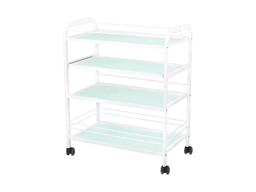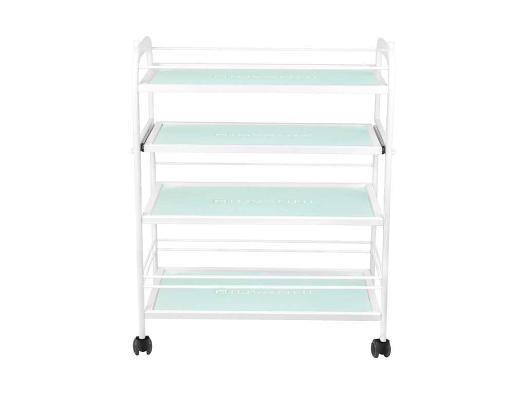 estetický stolík na kozmetické pomôcky, vyrobený z kovu a skla, s kolieskami. má štyri sklenené police.