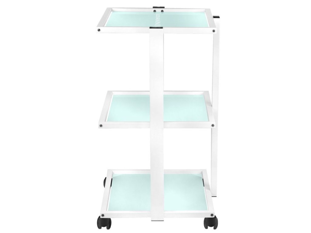 estetický stolík na kozmetické pomôcky, vyrobený z kovu a skla, s pogumovanými kolieskami. má tri sklenené police s vygravírovaným logom giovanni. je možné k nemu pripojiť zväčšovaciu lampu.
