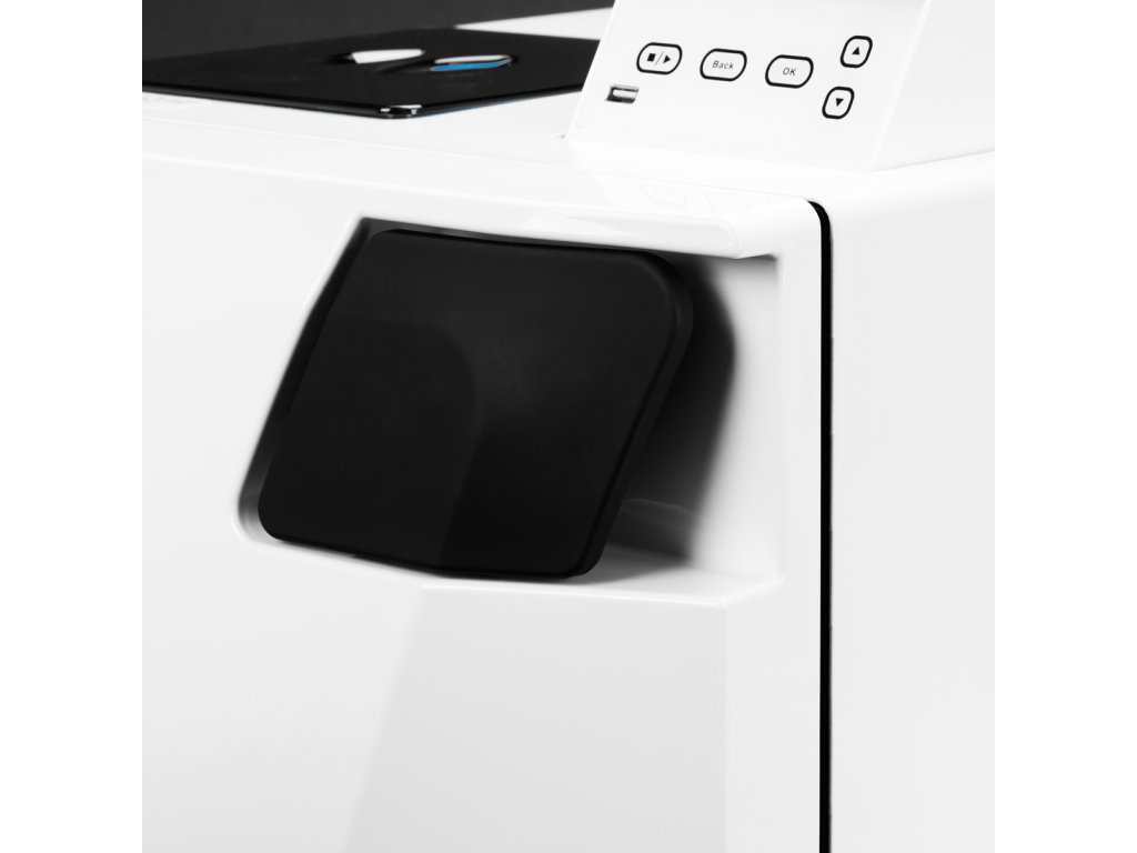 Zabudované nádrže na čistú a použitú vodu | Každá nádoba má objem 2,5 litra. Nádrž na čistú vodu je určená na destilovanú alebo deionizovanú vodu, ktorá sa bude používať na sterilizáciu. Prítomnosť nádržky na použitú vodu znamená, že nemusíme pamätať na externú nádobu. Odtok použitej (a čistej) vody sa nachádza na prednej strane prístroja. |